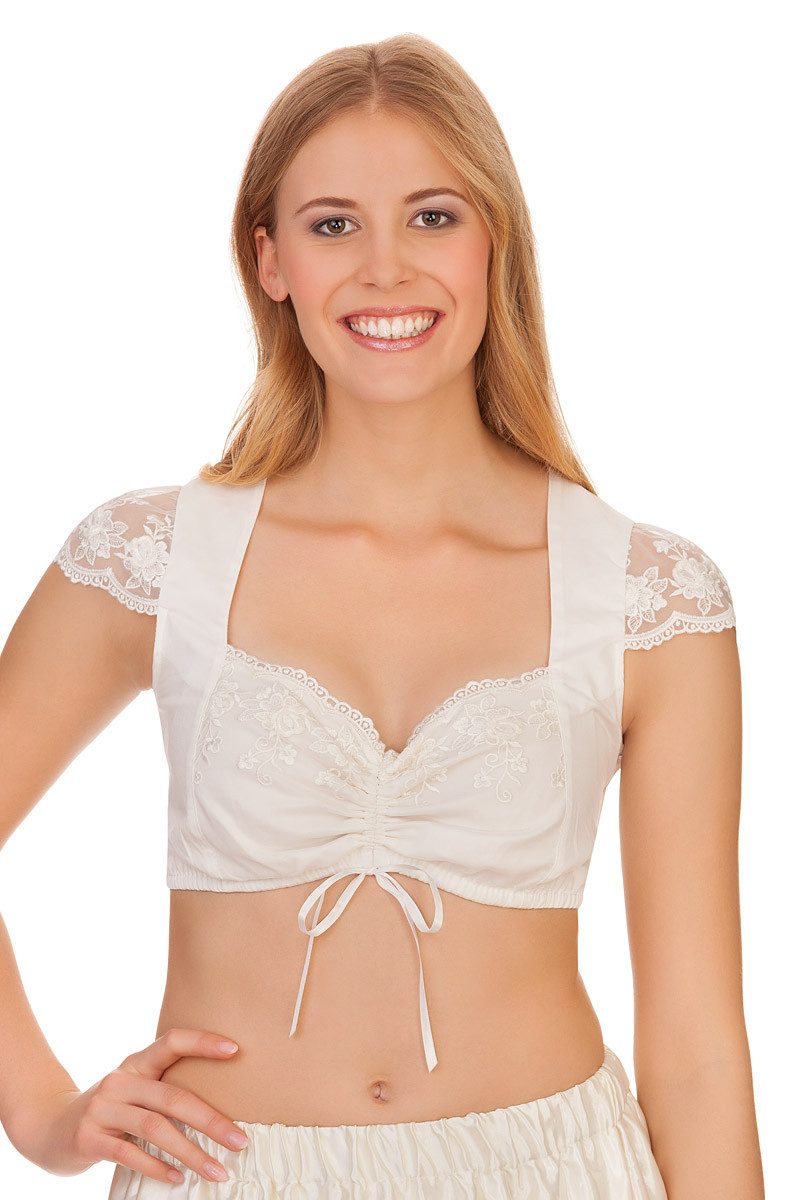 Die feine Dirndlbluse Silvie im eindrucksvollen Design der Marke Krüger Collection vereint verführerische Raffinesse mit vertäumten Country-Akzenten. Sie besteht hauptsächlich aus feiner Baumwolle und hat kurze, angeschnittene Tüll-Ärmel. Der sexy, tiefe Herz-Ausschnitt, verziert mit feiner, wellenförmiger Spitze, kann für ein reizvolles Dekolleté durch das Satin-Zugband individuell angepasst werden. Unter dem Ausschnitt sind zauberhafte, glänzende Blumen-Stickereien mit zarten 3D-Effekten eingearbeitet. Die angeschnittenen Tüll-Ärmelchen, bestickt mit dezent glänzenden Blumen, haben einen gewellten Spitzen-Abschluss. Der elastische Saum des fantastischen Trachtenstücks sorgt für einen perfekten Sitz.