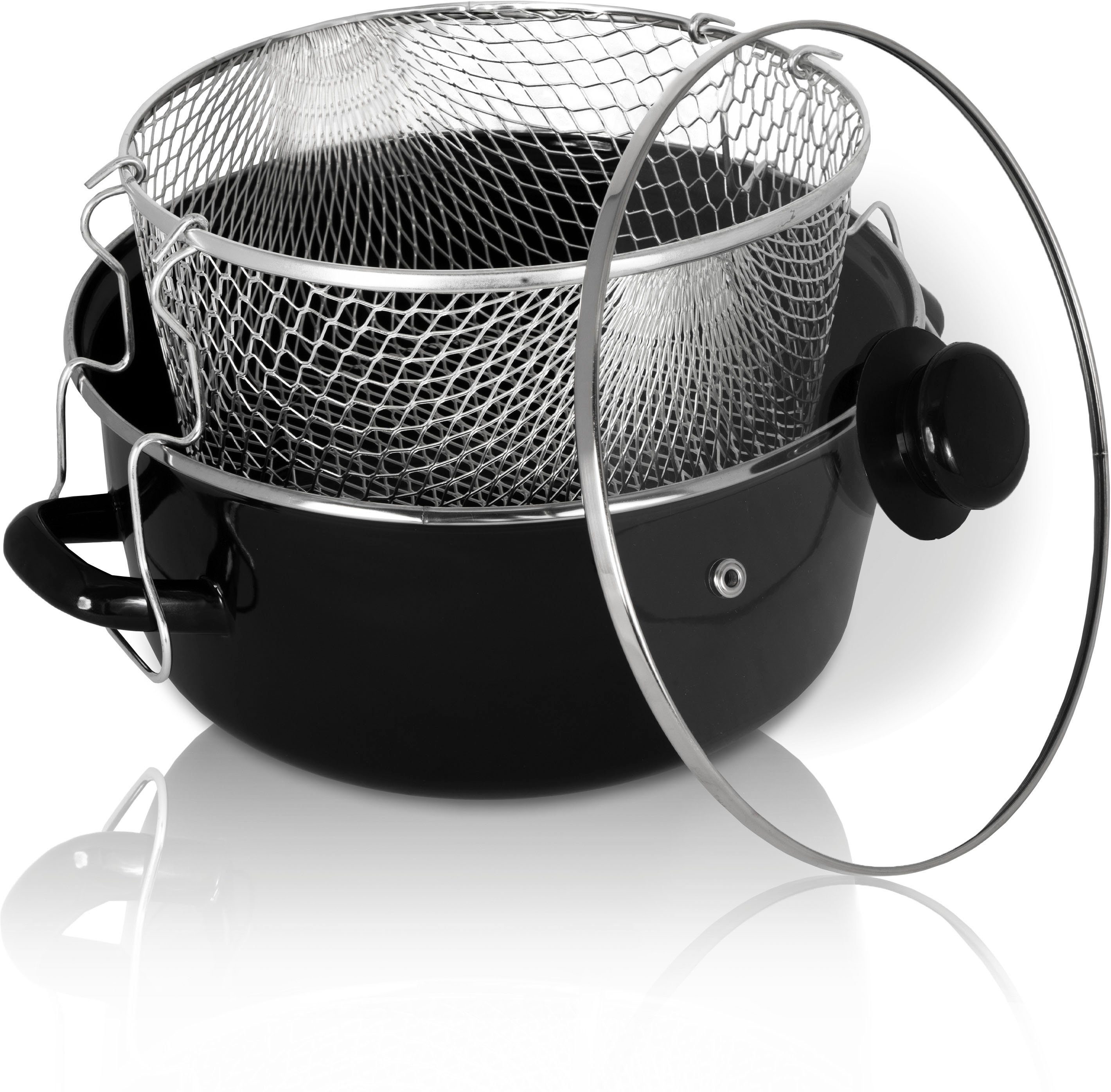 Der Emaille-Pommes-Frites-Topf mit Chromrand überzeugt durch seine vielseitige Verwendungsmöglichkeit: Er eignet sich ideal, um Pommes-Frites, Tapas, Calamares, Gebäck, Gemüse und viele weitere leckere Zutaten zu frittieren. Der Topf sogt für eine perfekte Wärmeleitung, sodass sich die Frittiertemperatur einfach und ganz nach Wunsch äußerst genau regeln lässt. Die porenfreie und glatte Oberfläche des Topfs ist bakterien- und schmutzabweisend. Der Siebeinsatz zum Einhängen eignet sich hervorragend dazu, das Frittierte abtropfen zu lassen. Der Topf ist für alle Herdarten geeignet, auch für Induktions-Kochfelder. Zudem ist er spülmaschinengeeignet und leicht & mühelos zu reinigen. Er erweist sich somit als praktischer Allrounder.