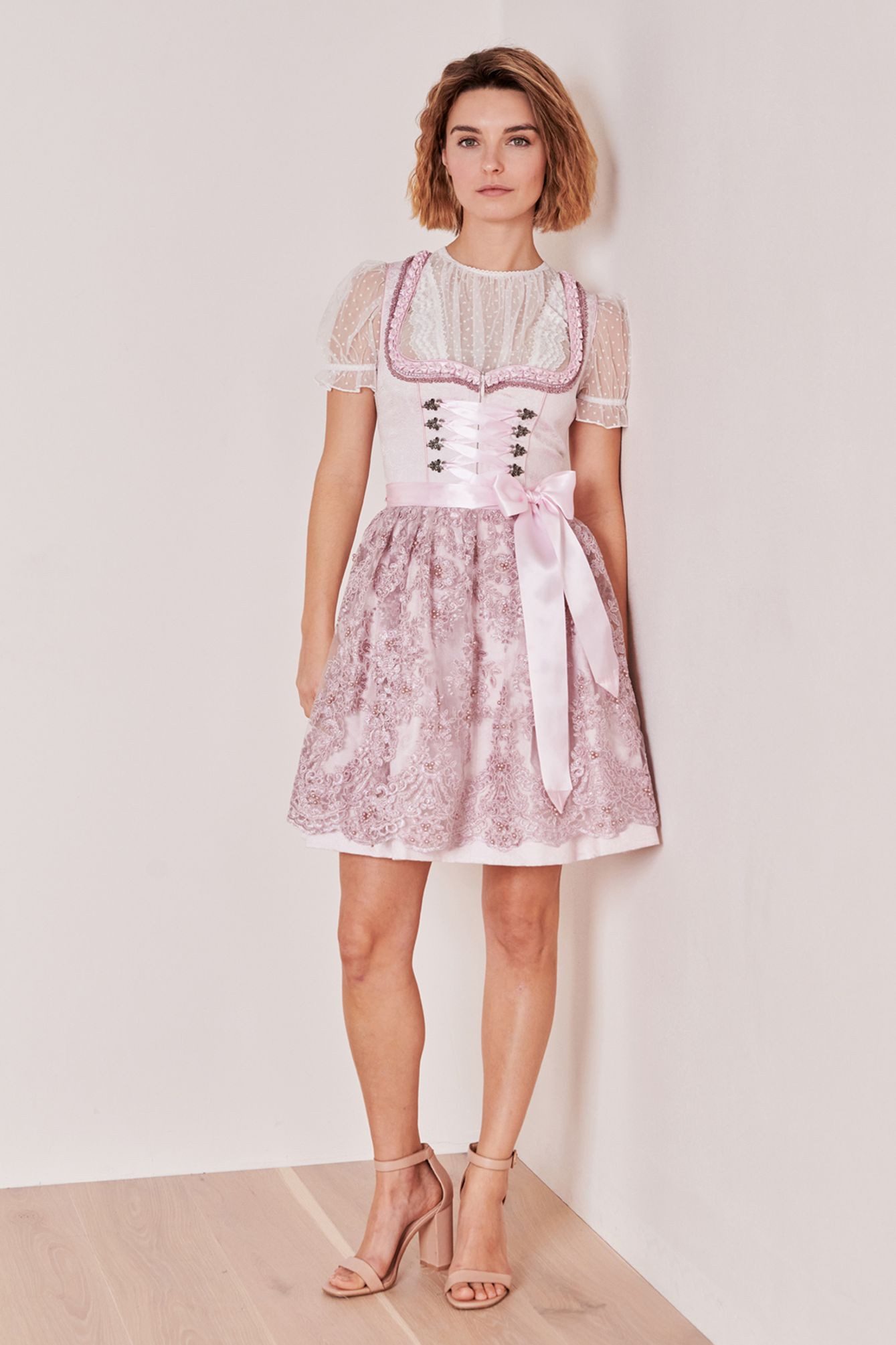 Erlebe das moderne Dirndl Fia mit seinem ornamenten Muster, welches einen Hauch von Eleganz verleiht und dich strahlen lässt. Es ist tailliert geschnitten, um deine Figur perfekt in Szene zu setzen. Der charmante Herz-Ausschnitt unterstreicht deine Weiblichkeit, während zwei Eingrifftaschen im Rock für praktischen Stauraum sorgen. Ein Reißverschluss vorne erleichtert das An- und Ausziehen. Der 50cm lange, mit Ornamenten verzierte Rock fällt bis zum Knie und sorgt für eine verspielte und gekonnt in Szene gesetzte Silhouette. Dazu kommt eine ärmellose Gestaltung für mehr Bewegungsfreiheit und angenhmen Tragekomfort. Die bestickte Perlenschürze setzt einen edlen, klassischen Akzent und die fehlende Miederschnürung schafft einen modernen und reduzierten Look. Mit diesem Dirndl bist du der absolute Hingucker auf wirklich jedem Volksfest!