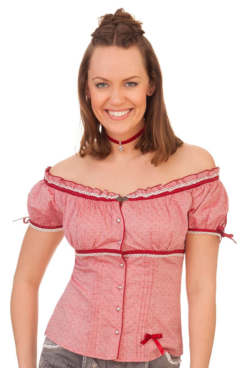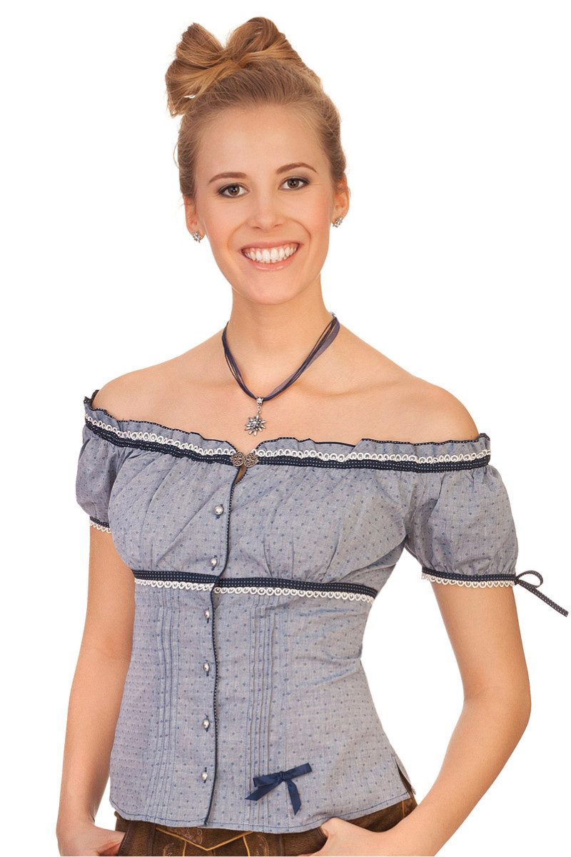 Die entzückende Bluse Alia im Carmen-Style zeigt sich zauberhaft romantisch. Sie besteht aus reiner Baumwolle und hat allover ein zartes, stilisiertes Blüten-Webmuster aus Punkten. Der taillierte Schnitt sorgt für den perfekten Sitz. Der Carmen-Ausschnitt ist traumhaft mit niedlicher Spitzenborte, Raffrüsche und Kontraststoff-Borte im Pünktchen-Look verziert und für einen optimalen Tragekomfort mit einem Gummizug versehen. Die Raffrüsche hat zudem eine Kontraststoff-Kante. Die kurzen Ärmel im Puffärmel-Look haben mit Spitzenborte und Kontraststoff betonte Bündchen, die durch eine Schleife aus Polka Dot-Stoff weitenverstellbar sind. Mit einer altsilbernen, filigranen Schließe aus zwei Ornamentik-Herzen beginnt die Knopfleiste oben und geht in silbermatte, süße Kugelknöpfe über. Sowohl Knopf- als auch -lochleiste sind edel mit Pünktchen-Kontraststoff abgepaspelt. Der Brustbereich ist für eine tolle Passform oben und unten gerafft und die untere Quernaht hinreißend mit Kontraststoff- und Spitzenborte verziert. Ab der Quernaht geben trachtige Biesen links und rechts neben der Knopfleiste sowie ein süßes Satin-Schleifchen links vorn über dem Saum den letzten Pfiff. Der Saum ist leicht gewölbt und seitlich geschlitzt. Das verführerische Design stammt von der Marke Krüger Madl.