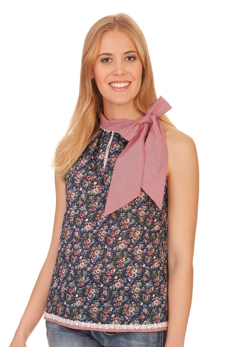Die bezaubernde Trachtenbluse Sonja stammt aus dem Hause Krüger Madl und wird das neue Lieblingsstück für den Sommer. Sie ist tailliert geschnitten, ärmellos und besteht aus reiner Baumwolle. Der allover grandiose Blumen-Print harmoniert wundervoll mit dem ringsum feschen Stehkragen aus trachtigem Karo-Stoff. Vorn seitlich hat der Kragen einen Knopf zum Fixieren und die Verlängerungen werden zu einer feschen Schleife gebunden. Der untere Kragenrand ist mit toller Spitzenborte veredelt, ebenso der kleine Schlüsselloch-Ausschnitt vorn. Unter dem Kragen ist die Bluse schön gerafft. Die Armausschnitte der leichten Sommerbluse gehen schräg bis zum Halsansatz (amerikanische Schulter) und sind mit feschem Karo-Stoff umsäumt. Auch der Blusensaum besteht aus dem niedlichen Karo-Stoff und ist zudem mit schöner Spitzenborte veredelt.