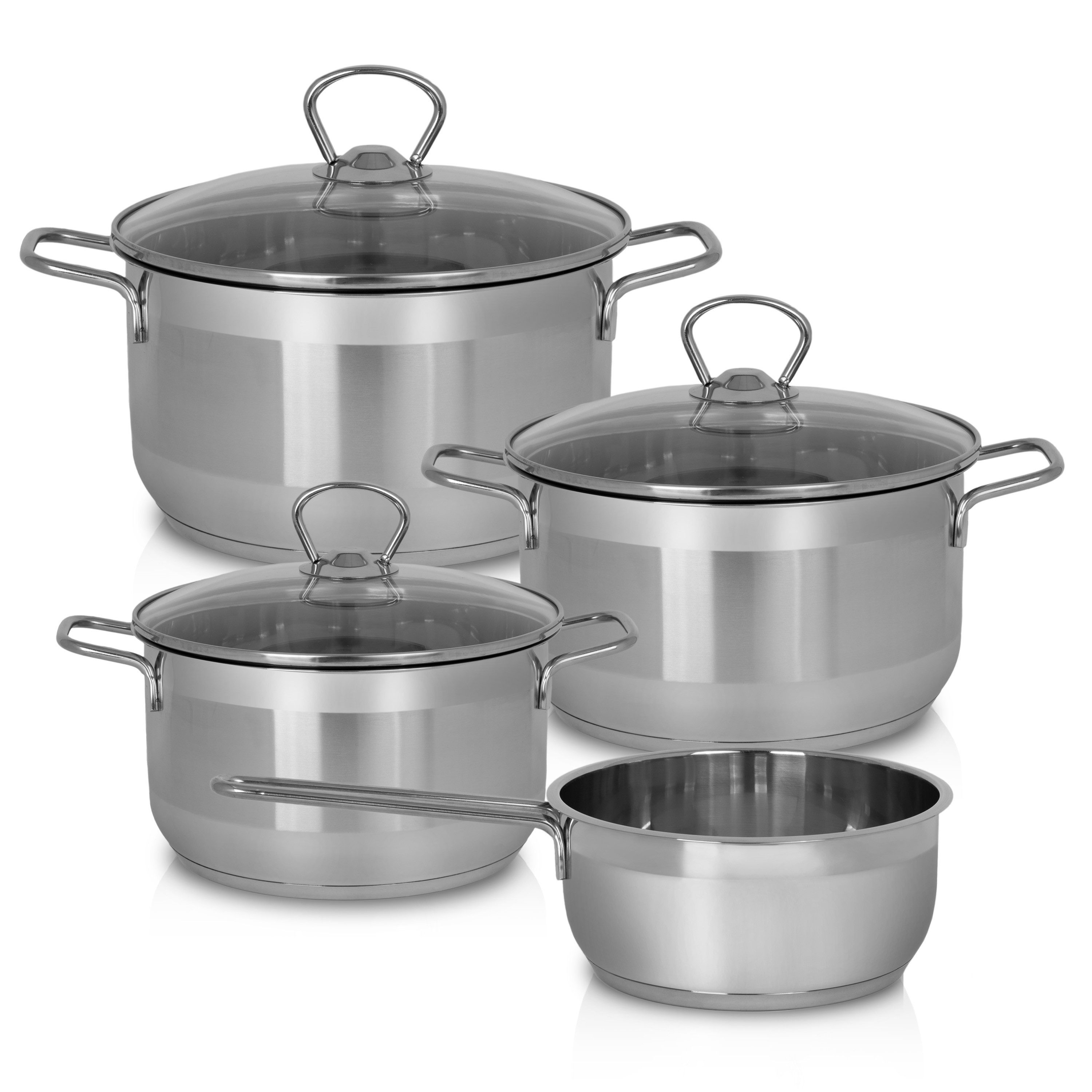 Das 4-tlg. Edelstahl-Set der Serie MANHATTAN überzeugt mit hochwertigem, rostfreiem Edelstahl in glänzender Optik und edlem Satin-Dekorband. Dank des 3-Schicht-Thermobodens wird die Wärme optimal verteilt, wodurch energiesparendes und gleichmäßiges Kochen auf allen Herdarten, inklusive Induktion-Kochfeldern, möglich ist. Die hitzebeständigen Glasdeckel mit Edelstahlring und Dampfaustrittsöffnung ermöglichen ein komfortables Sichtkochen und die wärmeabweisenden Kaltmetallgriffe sorgen für eine sichere Handhabung. Zudem erleichtert der praktische Schüttrand das tropffreie und präzise Umfüllen von Flüssigkeiten. Ein vielseitiges Topf-Set für höchsten Kochkomfort!