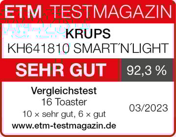 Die KRUPS KH641810 SMART’N‘ LIGHT erzielt im Vergleichstest des „ETM Testmagazins“ mit 15 weiteren Toastern das Gesamtergebnis „sehr gut (92,3 %)“. Die sehr hohe Funktionalität überzeugt: Z. B. sind die Bräunung und die Bräunungsgrade „sehr gut“. Das Gerät ist einfach zu bedienen. Außerdem bietet es sehr viele Funktionen und ist „gut“ verarbeitet. Insgesamt gehört das Modell zum mittleren Bereich des starken Testspektrums.
