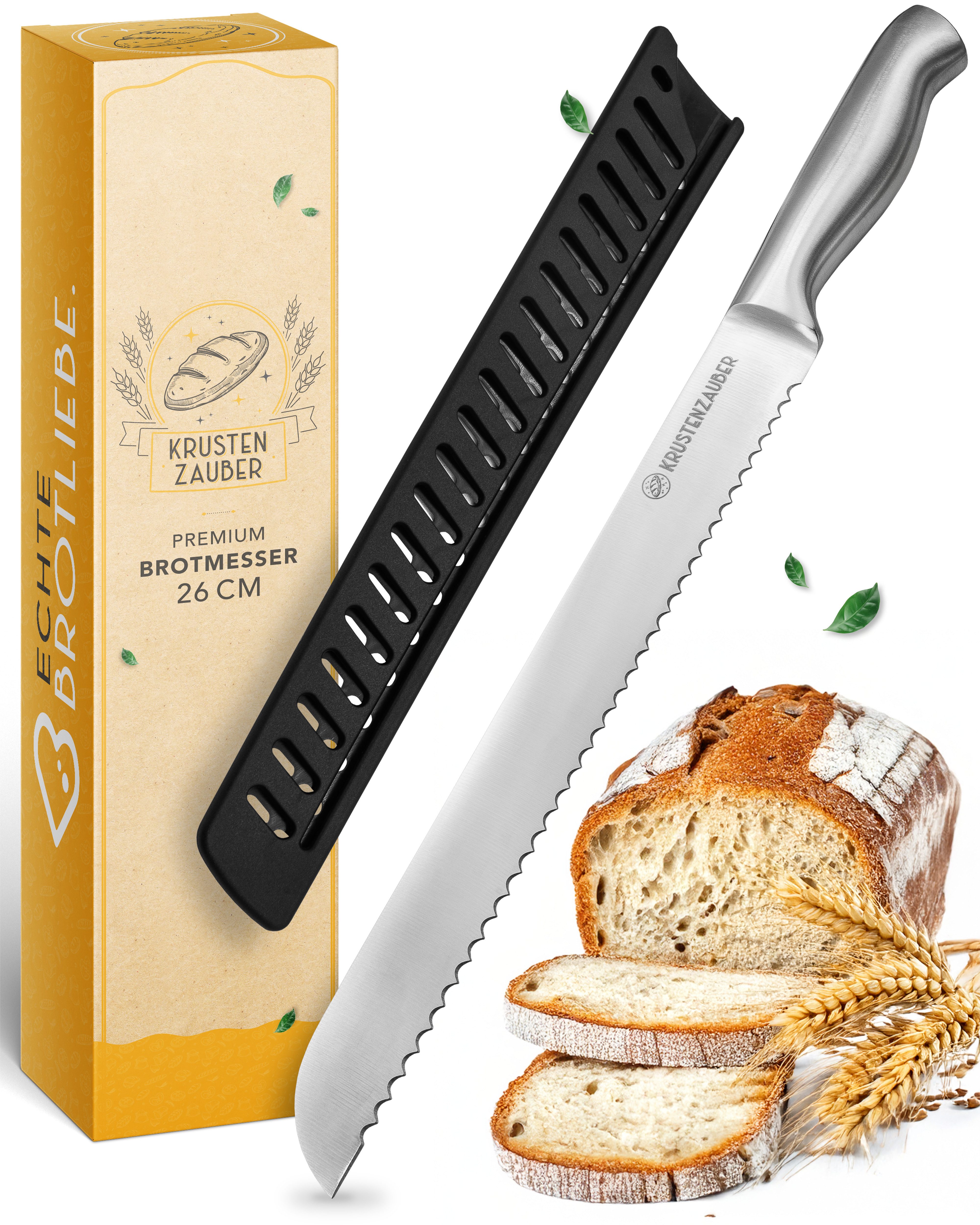 Das KRUSTENZAUBER Brotmesser ist in mehreren Вариантыn erhältlich – mit 20 cm Klinge für handliche Brötchen, Baguettes und kleinere Brote sowie mit 26 cm Klinge für große Laibe, Sauerteig oder knusprige Vollkornbrote. Die scharfe Edelstahlklinge sorgt für sauberes Schneiden durch harte Krusten und weiches Inneres, ohne das Brot zu zerdrücken. Gefertigt aus rostfreiem Edelstahl, überzeugt das Messer durch Langlebigkeit, hygienische Reinigung und eine dauerhaft zuverlässige Schneide. Ob als Brotmesser, Brotsäge oder Küchenmesser – das KRUSTENZAUBER Messer ist vielseitig einsetzbar und ein unverzichtbares Werkzeug in jeder Küche. Mit seinem ergonomischen Griff liegt es angenehm in der Hand und bietet auch bei längerem Schneiden maximale Kontrolle und Komfort – ideal für Hobbybäcker und Profis. Das zeitlose Design und die präzise Verarbeitung machen das Brotmesser zum perfekten Begleiter beim Schneiden von Baguette, Ciabatta, Vollkorn- oder Sauerteigbrot.