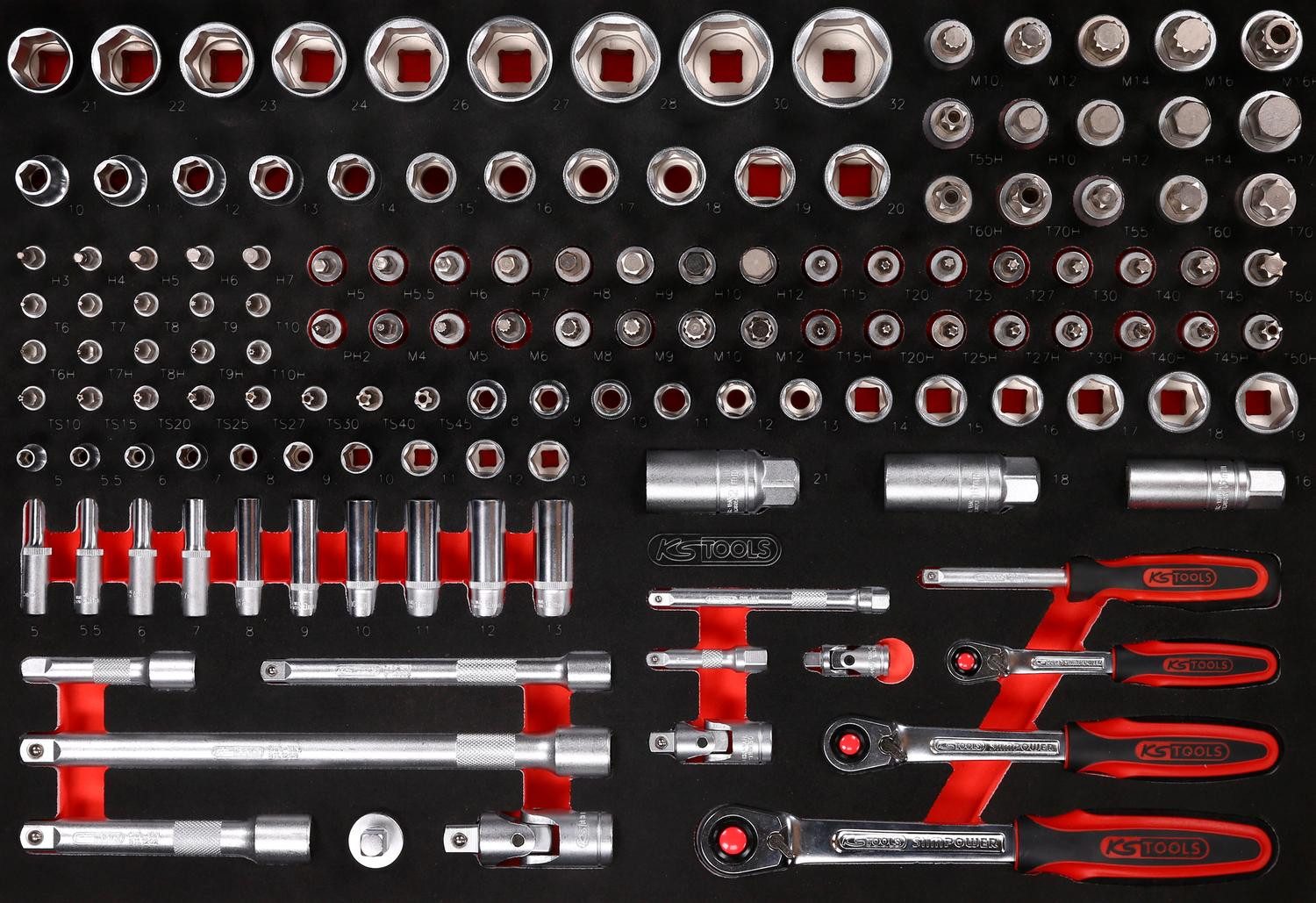 KS Tools Werkzeugwagen 1/4" + 3/8" + 1/2" Steckschlüssel-Satz in Schaumstoffeinlage, 139-tlg