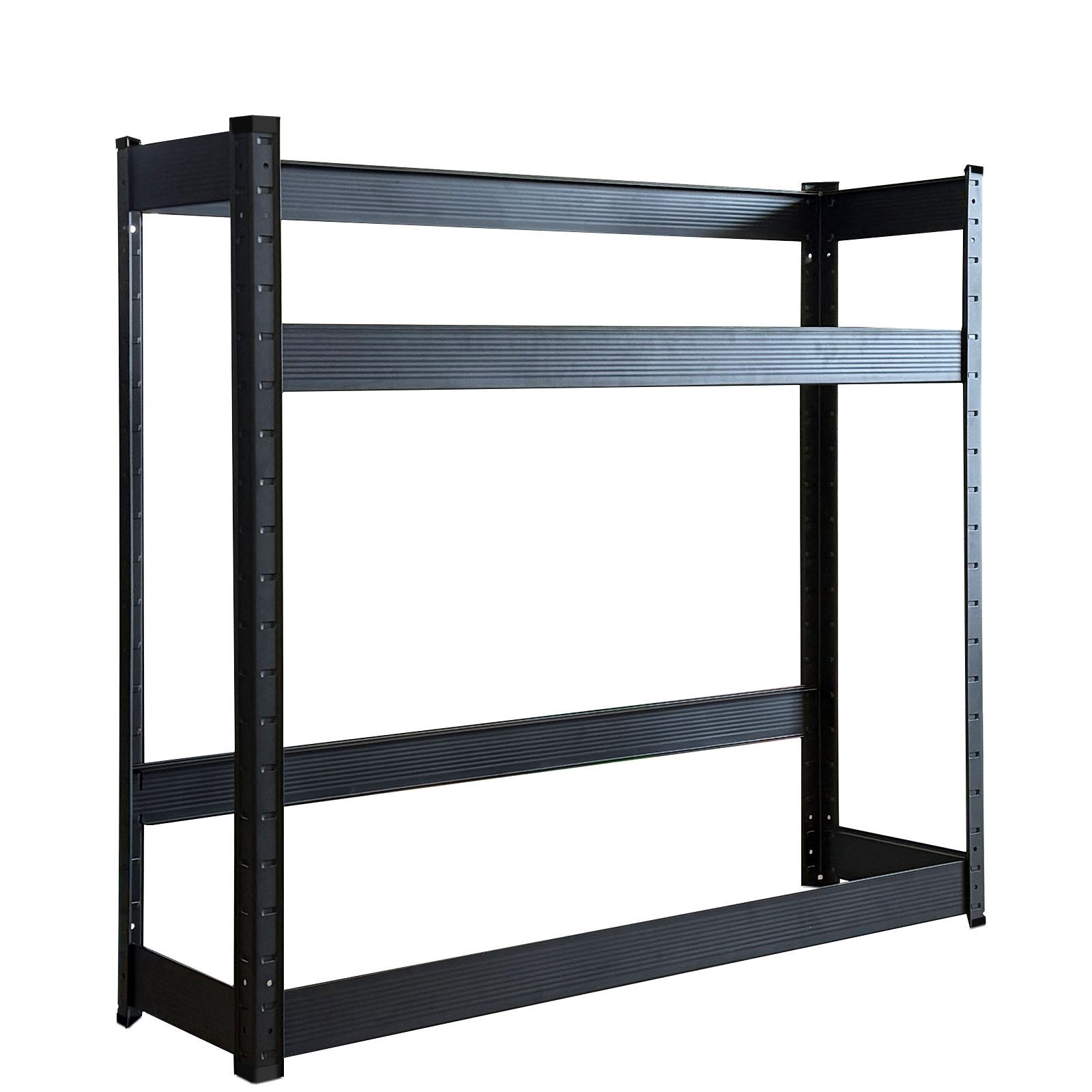 Die Oberfläche ist mit einer rostbeständigen Pulverbeschichtung versehen, die den Stahl effektiv vor Feuchtigkeit schützt und das Regal besonders langlebig macht – ideal für den langfristigen Einsatz auch in feuchteren Umgebungen wie Kellern oder Lagerräumen.