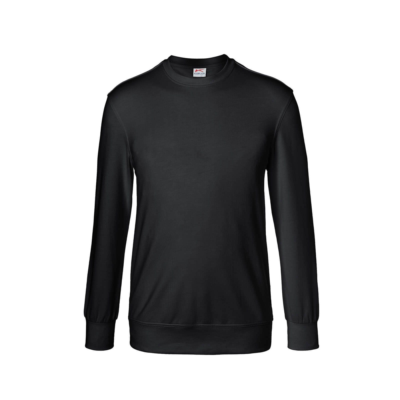 Rundhalsausschnitt mit Halsbündchen und Nackenband|Langarm|Doppelnaht an Arm- und Saumabschluss|Formstabile Ärmel- und Saumbündchen|Leasingkoller|Aufhängebänder im Saum zum Trocknen in der industriellen Wäsche|Fusselfreie Innenseite (French-Terry)|Geprüft nach EN ISO 15797|