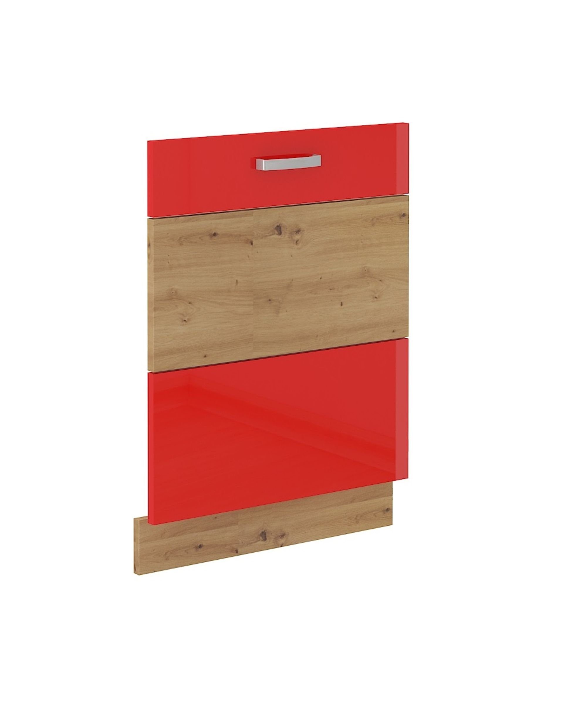 Frontausführung: MDF Hochglanz Rot + Absatz Eiche Artisan.