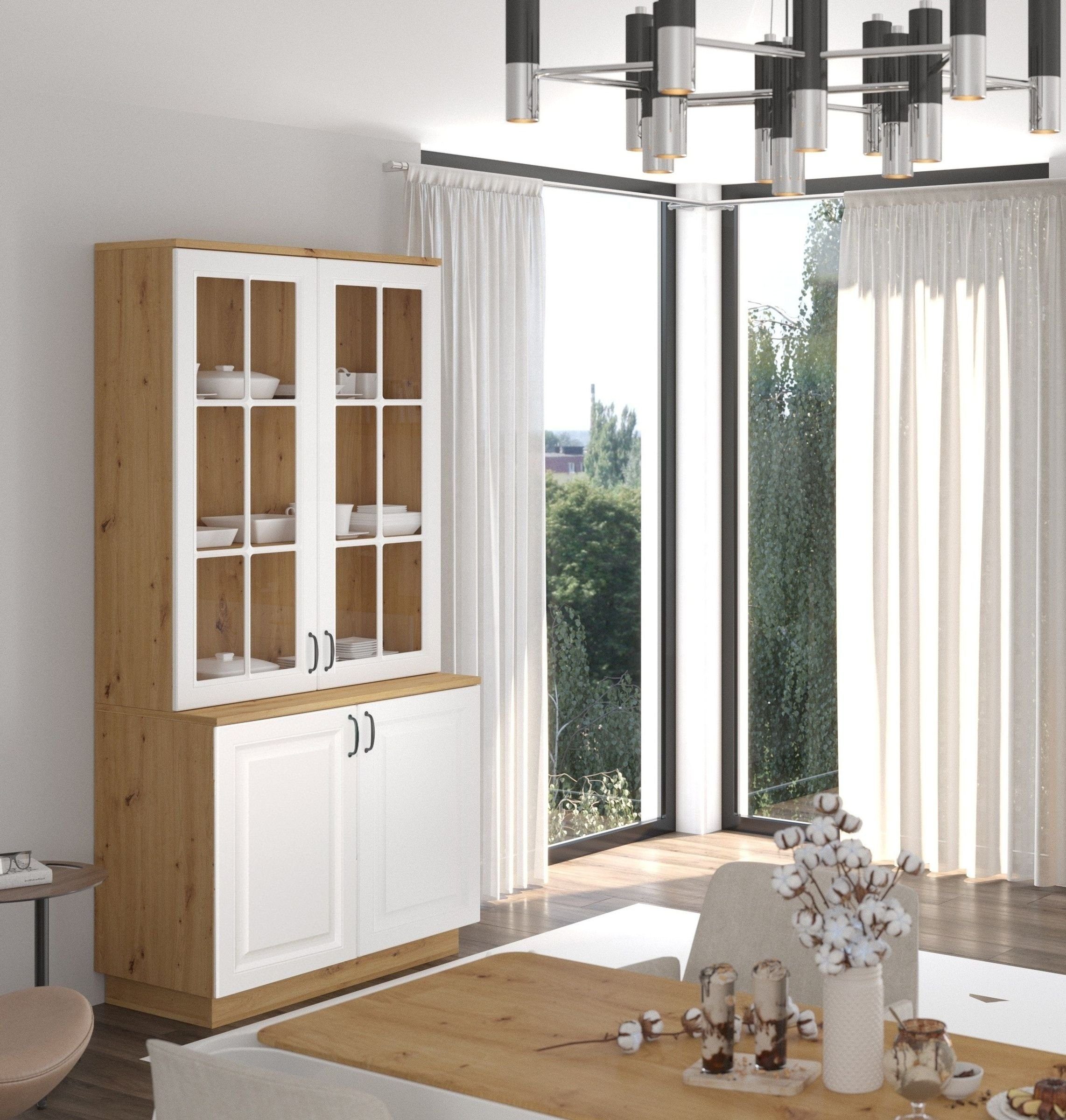 Dieses Küchenbuffet ist eine optimale Ergänzung für Ihre vorhandene Küche, oder Ihr Esszimmer. Mit einem modernen und kreativen Design verleiht das Buffet Geschmack und Gemütlichkeit. Das Buffet gibt Ihnen genug Stauraum, um Ihre Utensilien bequem zu verstauen. Das Buffet besteht aus einem Unterschrank mit 2x Türen, sowie einem auf den Unterschrank montierten Aufsatzschrank mit 2 Glastüren.