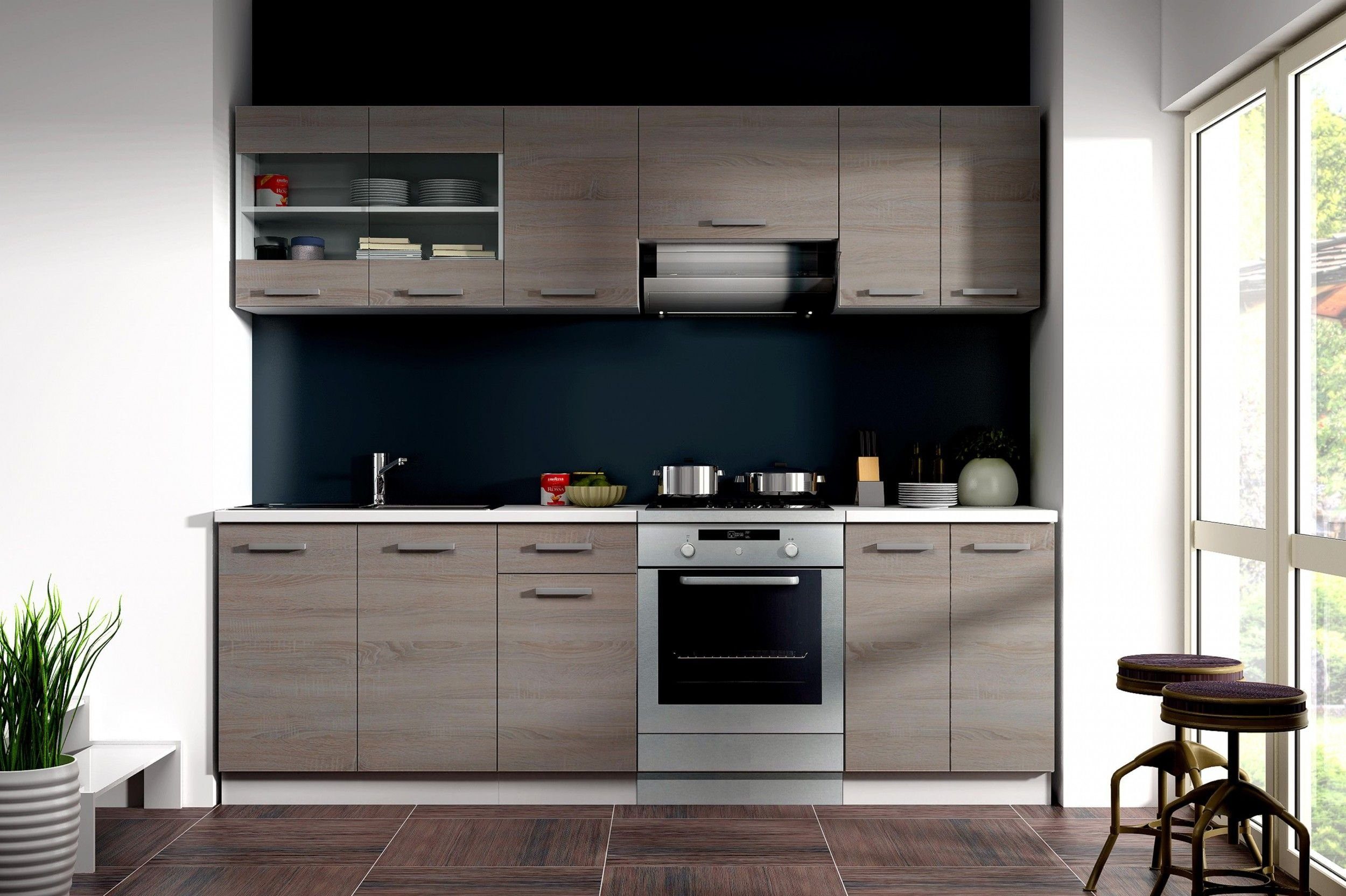 Die Küche Dave besteht aus sieben frei kombinierbaren Einheiten, die Ihnen viel Platz für Ihre Küchenutensilien geben. Zur unteren Zeile gehören ein Spülenunterschank mit zwei Türen, ein Unterschrank mit Schubkasten und Tür sowie ein zweitüriger Unterschrank. Auf Wunsch können Sie auch einen passenden Herdunterschrank sowie eine Edelstahlspüle mitbestellen. Die obere Zeile umfasst einen praktischen Glashängeschrank mit zwei Glastüren, einen zweitürigen sowie einen eintürigen Hängeschrank und einen Kurzhängeschrank. Aufgrund dieser flexiblen Anordnung können Sie Ihr Kücheninventar flexibel verstauen, ohne dass die einzelnen Elemente Sie zu viel Platz in Ihrer Küche kosten.