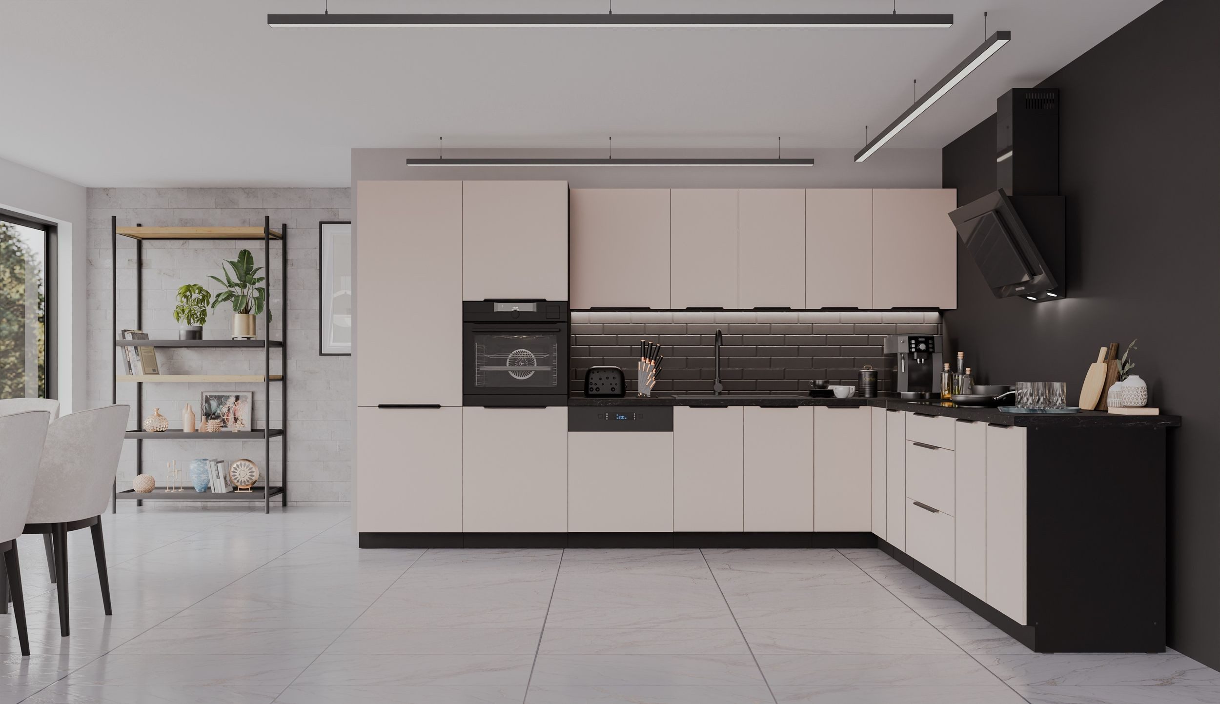 Die vielseitige Küche ARONA im modernen Mix aus der neuen Trendfarbe Kaschmir beige matt und schwarz matt, ist ein wahres Kombinations- und Stauraumwunder, in dem alle ihre Küchenutensilien Platz finden. Das edle Design und die gute Verarbeitung tun ein Übriges, um aus ihrer Küche eine Wohlfühloase zu machen. Все Türscharniere und Schubladen sind mit hochwertigen Dämpfern, für leises Спрятать der Fronten ausgestattet.