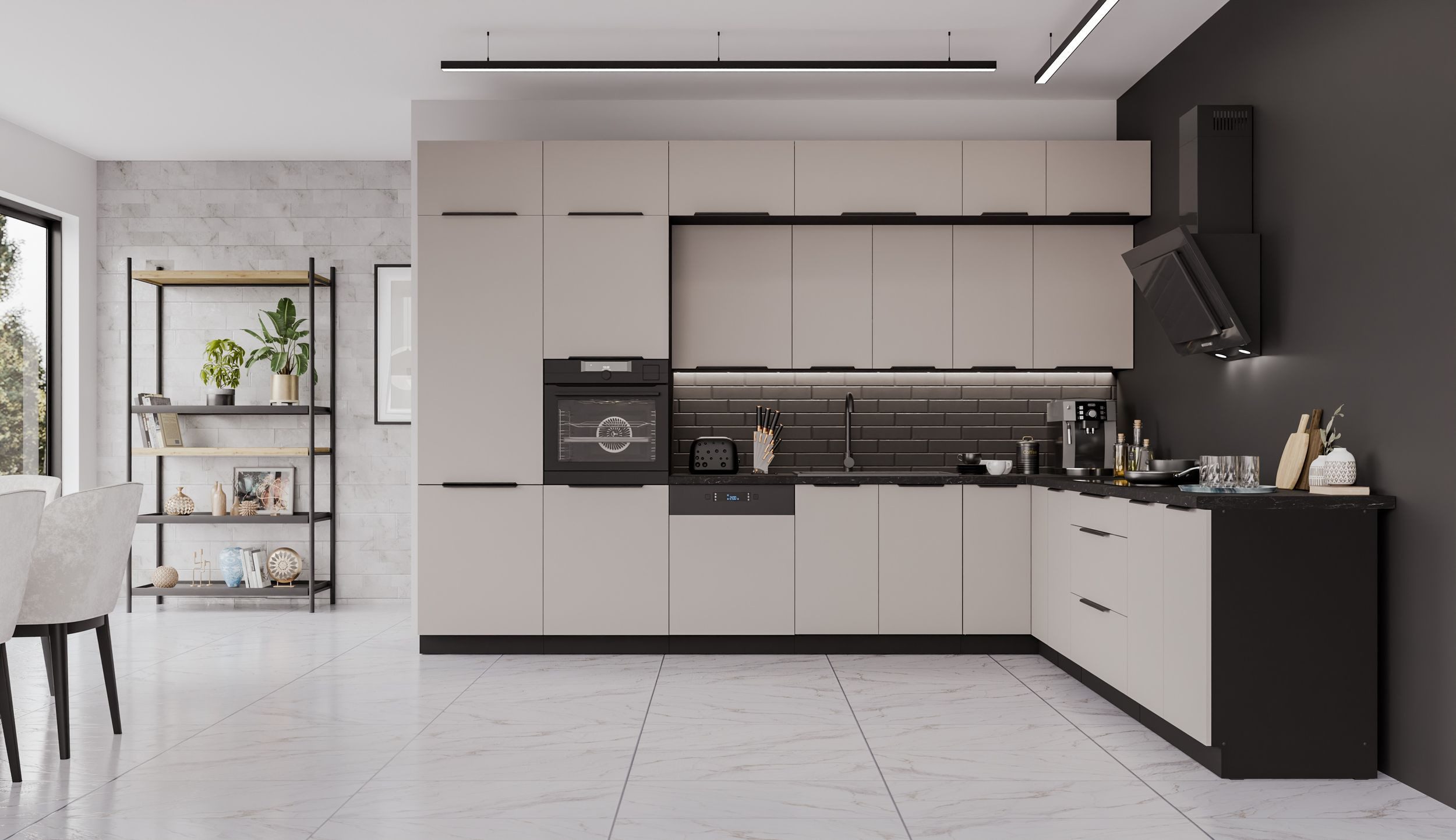 Die vielseitige Küche ARONA im modernen Mix aus der neuen Trendfarbe Kaschmir beige matt und schwarz matt, ist ein wahres Kombinations- und Stauraumwunder, in dem alle ihre Küchenutensilien Platz finden. Das edle Design und die gute Verarbeitung tun ein Übriges, um aus ihrer Küche eine Wohlfühloase zu machen. Все Türscharniere und Schubladen sind mit hochwertigen Dämpfern, für leises Спрятать der Fronten ausgestattet. Ergänzend kommen hier noch 6x Aufsatzschränke (NAGU) hinzu, um noch mehr Stauraum zu erhalten.