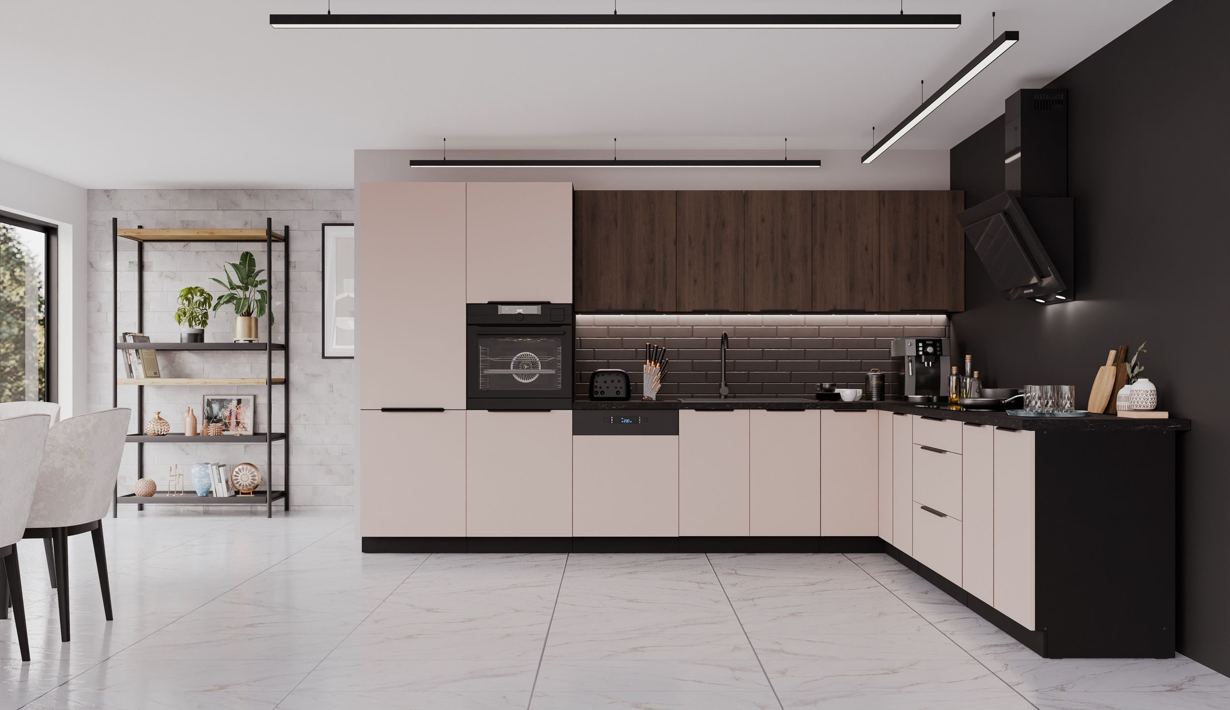 Die vielseitige Küche ARONA + MONZA im modernen Mix aus den neuen Trendfarben Kaschmir beige matt + Okapi Nußbaum und schwarz matt, ist ein wahres Kombinations- und Stauraumwunder, in dem alle ihre Küchenutensilien Platz finden. Das edle Design und die gute Verarbeitung tun ein Übriges, um aus ihrer Küche eine Wohlfühloase zu machen. Все Türscharniere und Schubladen sind mit hochwertigen Dämpfern, für leises Спрятать der Fronten ausgestattet.