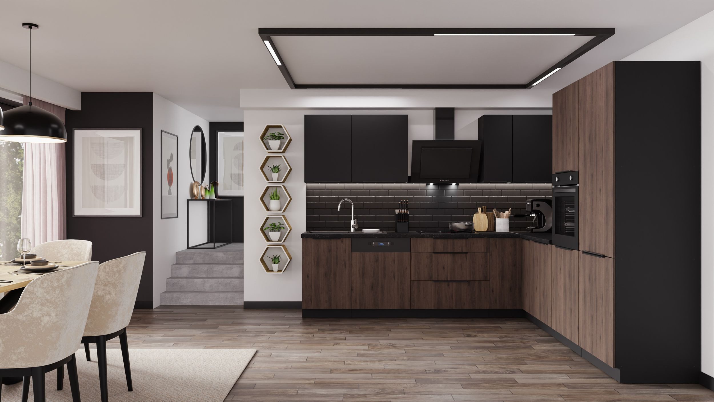 Die vielseitige Küche MONZA + SIENA im modernen Mix aus Okapi Nussbaum und schwarz matt Design ist ein wahres Kombinations- und Stauraumwunder, in dem alle ihre Küchenutensilien Platz finden. Das edle Design und die gute Verarbeitung tun ein Übriges, um aus ihrer Küche eine Wohlfühloase zu machen. Все Türscharniere und Schubladen sind mit hochwertigen Dämpfern, für leises Спрятать der Fronten ausgestattet.