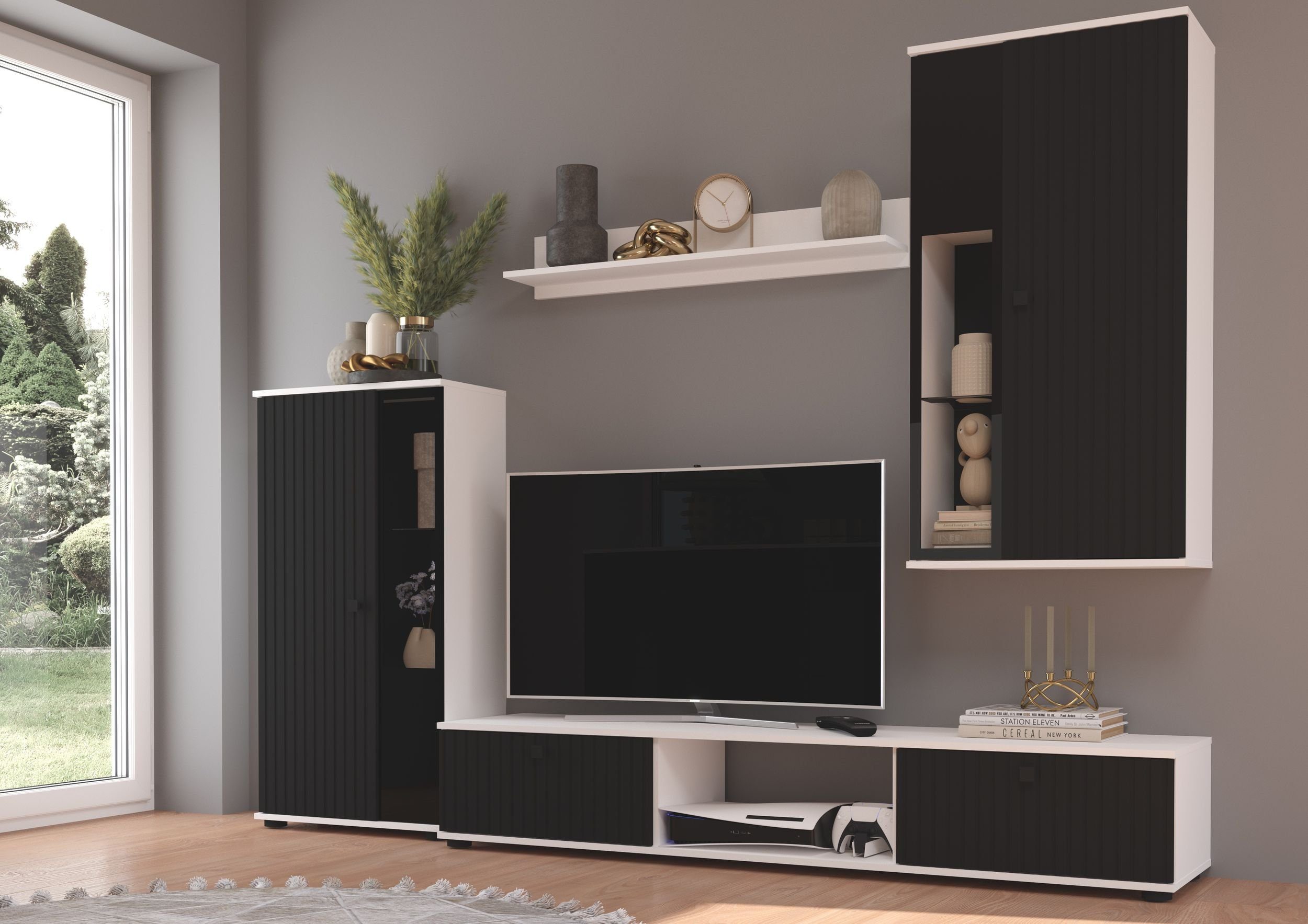 Sie erhalten die Wohnwand Salsa ohne Dekoration, ohne elektrische Geräte und ohne Beleuchtung.