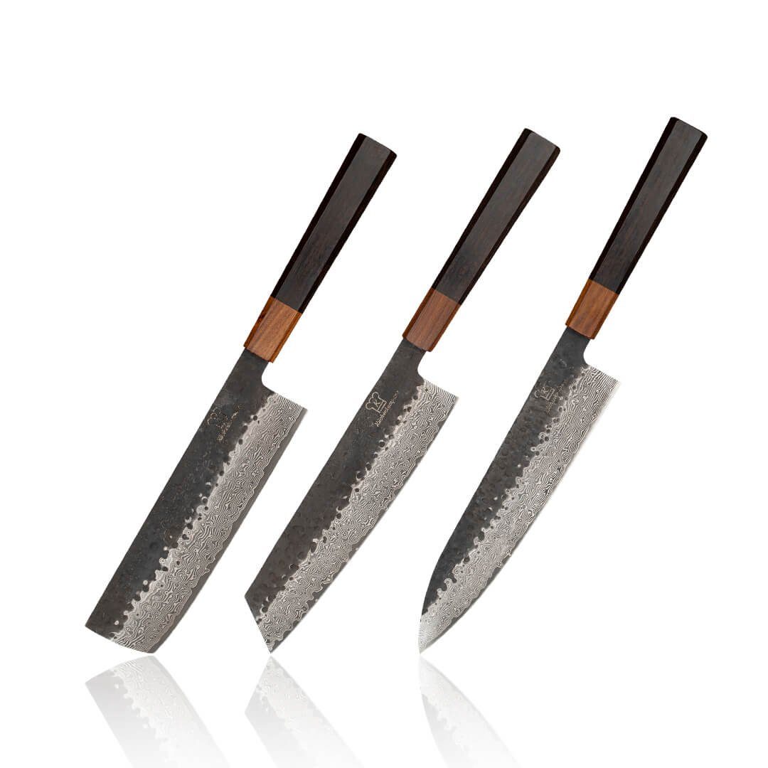 Shikku. Eine der, wenn nicht sogar die hochwertigste Serie, hergestellt in unserer Schmiede. 67 Lagen Damaszener Stahl und 15° Schleifwinkel lassen die Messer durch dein Schnittgut durch gleiten. Mit der Shikku Serie arbeiten die Messer für dich und nicht du für die Messer! Spezifikationen: - 67 Lagen Damaszener Stahl - Konsolidierter Bambus Griff - 62 HRC - 2.6mm Stahlstärke