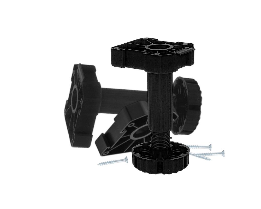 Der verstellbare Möbelfuß ist für eine 85er Sockelhöhe im Möbelbau geeignet. Der Sockefuß besteht aus einer Aufnahmeplatte, dem Sockelgleiter und dem Stützfuß, welcher sich, ausgehend von der mittigen Arretierung, 10 mm eindrehen und 18 mm herausdrehen lässt. Unter dem Möbel verschraubt, in die gewünschte Position gebracht, besteht zudem die Möglichkeit, die Sockelblendenmontage mit Hilfe des beiliegenden Sockelclips am Stützfuß durchzuführen. Natürlich werden die zur sofortigen Montage benötigten Schrauben der Lieferung beigelegt, so dass einer Möbelmontage nichts mehr im Weg steht.