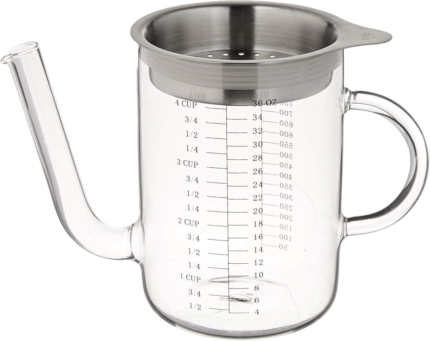 Fett-Trenn-Kanne aus Borosilikatglas mit Edelstahlsieb. Keinerlei Plastik. Inhalt: 1 Liter, mit Skala in ml und oz, In Geschenkverpackung. Spülmaschinenfest.
