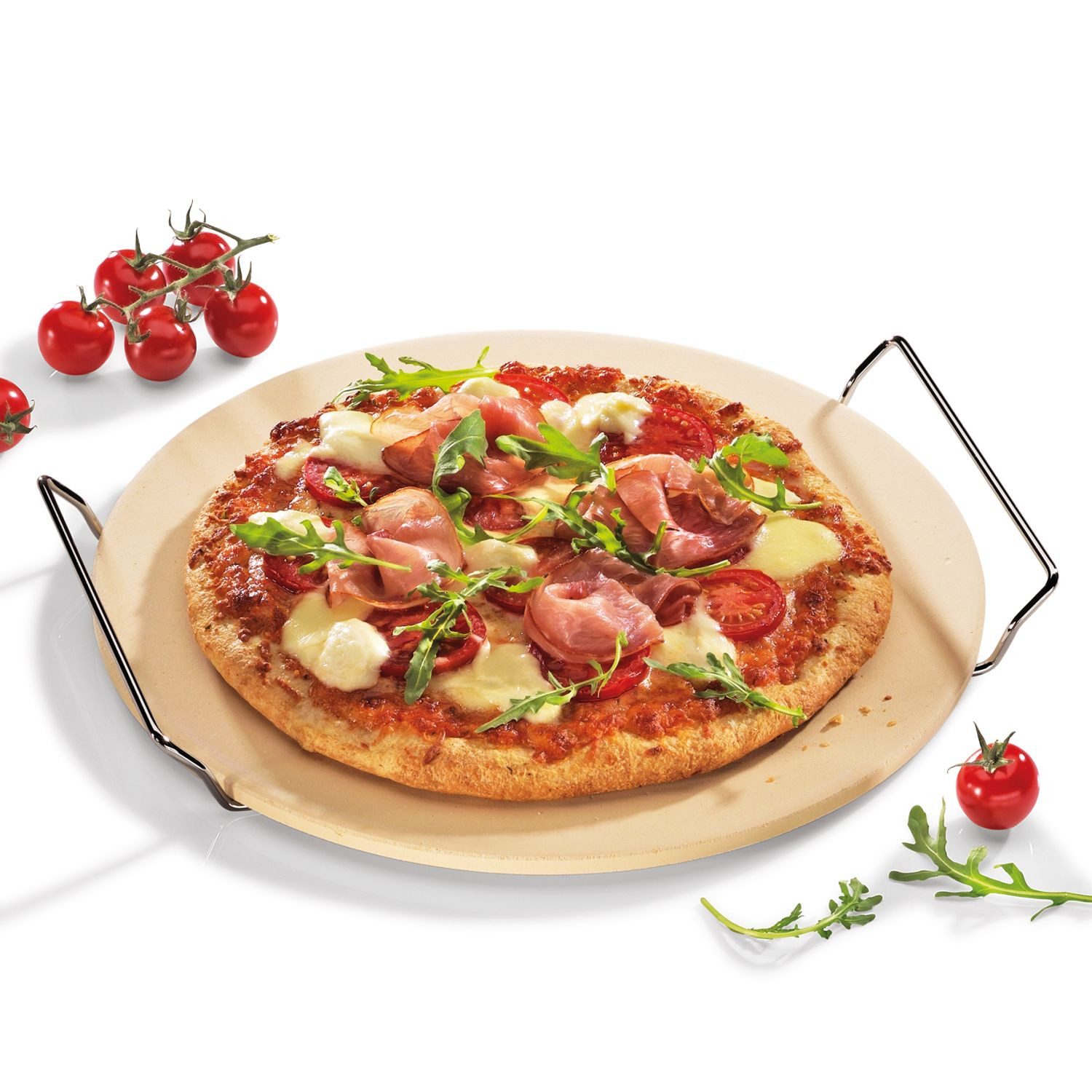 Lust aufs Kochen entsteht von ganz allein, wenn die richtigen Werkzeuge zum Vorbereiten, Schneiden und Schälen vorhanden sind. Damit der leckere Pizza-Boden wie beim Italiener schön dünn und wunderbar kross wird, braucht es keinen professionellen Pizza-Ofen, für die leckere Pizza Zuhause ist der runde Pizzastein von Küchenprofi hervorragend geeignet. Der feuerfeste Stein aus Cordierit-Keramik wird dafür 10 bis 15 Minuten im Ofen aufgeheizt und nimmt so die Feuchtigkeit aus dem Teig. Zudem ist der Stein auch für die Zubereitung von Flammkuchen geeignet. Im Lieferumfang enthalten ist außerdem ein Untersatz aus Edelstahl mit seitlichen Griffen, eine Bedienungsanleitung und ein Pizzarezept. Der Pizza-Stein hat einen Durchmesser von 30 cm.