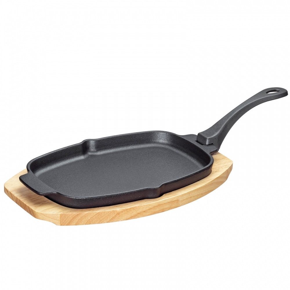 Deine neue ovale Servierpfanne für den Grill, die Kochplatte oder BBQ ist von Küchenprofi und kommt mit abnehmbarem Griff. Die Pfanne aus wärmespeicherndem Gusseisen hält deine Speisen lange warm. Der praktische Gegengriff hilft beim heben und servieren. Das inkludierte Pinienholzbrett ist ideal zum stilvollen Servieren. Eine Mulde im Servierbrett hält die Pfanne sicher. Die Servierpfanne ist für alle Herdarten geeignet.