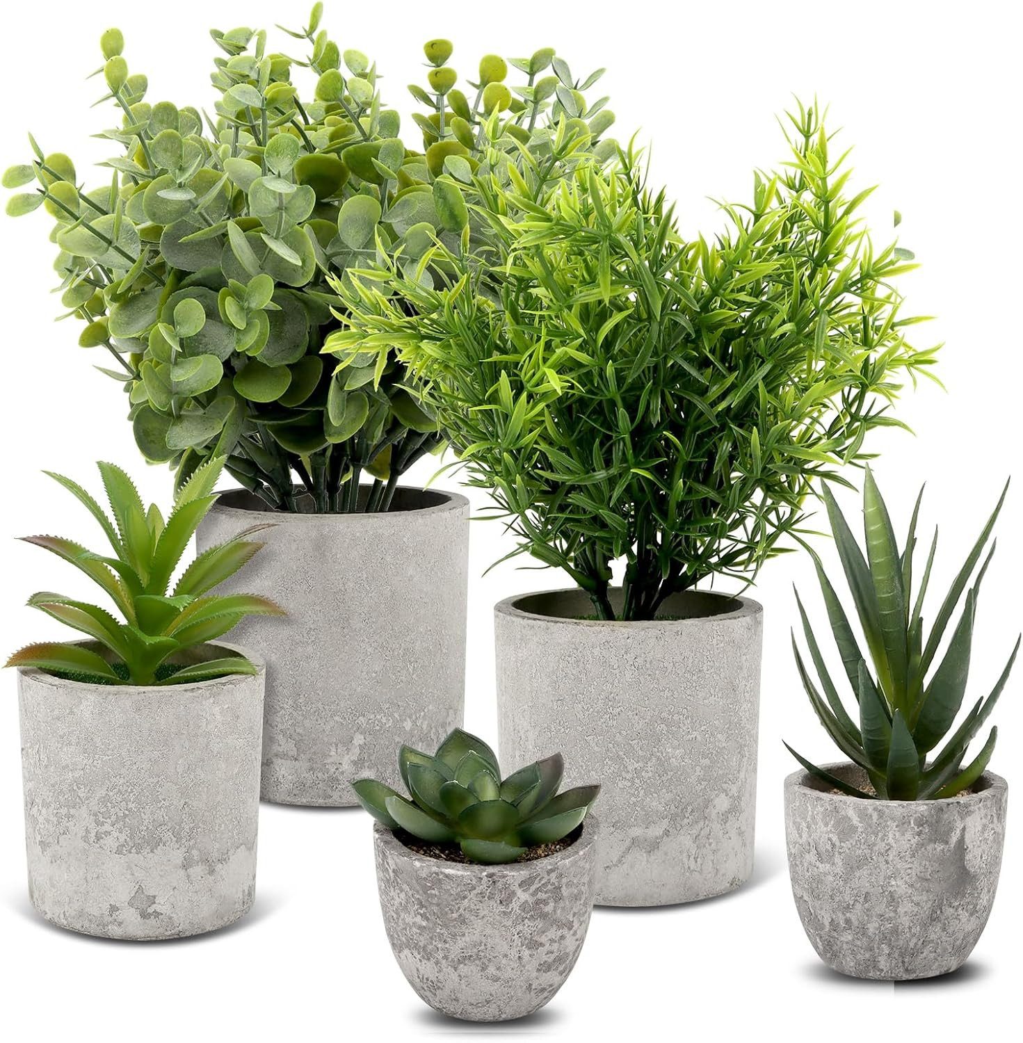 TOPFGRÖSSE- (Schlangenzunge Topfpflanze: 22cm/8.66in*8cm/3.15in), (Besprenkelte große Eukalyptus Topfpflanze: 22cm/8.66in*8cm/3.15in.), (Eagle Clawed Rutabaga Topfpflanze: 14cm/5.51in*7cm/2.76in.), (Sukkulente Topfpflanze: 7cm/2.76in**7cm/2.76 in), (Lime Green Agave Succulent Pot: 15cm/5.91in*10cm/3.94in) Kunstpflanze mit Topf patzsparendes kompaktes Design ist perfekt für Tische, Regale, Fensterbänke oder Schreibtische, und ihre eleganten grauen Zellstoffkanister kommen mit simulierter Schaumstofferde, die perfekt mit modernen/vintage Interieurs harmoniert.