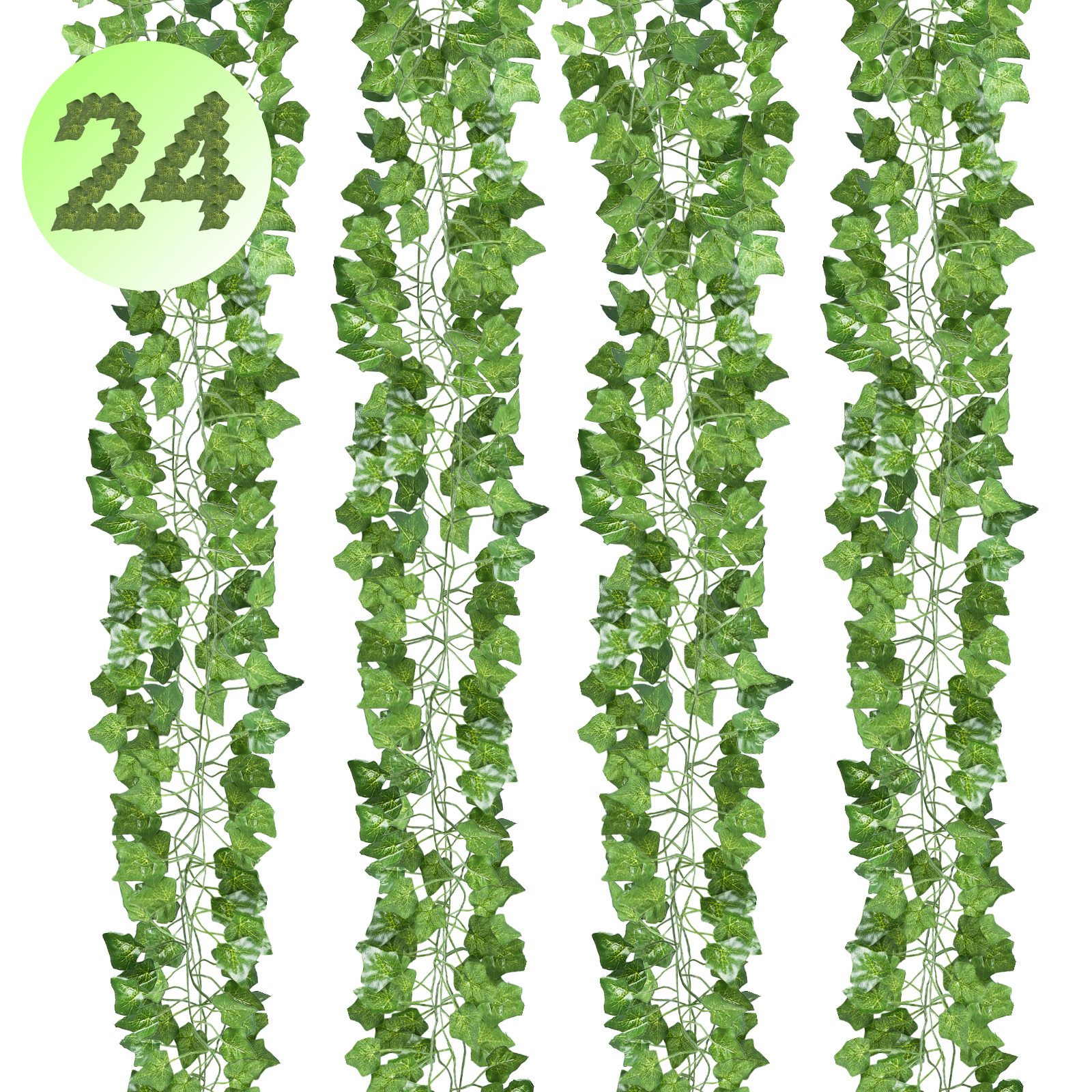EFEU KÜNSTLICH: 24 Stränge Efeu Hängend Girlande von Pflanzen. Jede Efeugirlande Künstlich ist etwa 2.4 m lang und hat 80 Blätter mit einer Gesamtlänge von 28.8 m und einer Blattgröße von 4 cm. Wir bieten 100 Stück Kabelbinder zum Aufhängen von Efeu an.