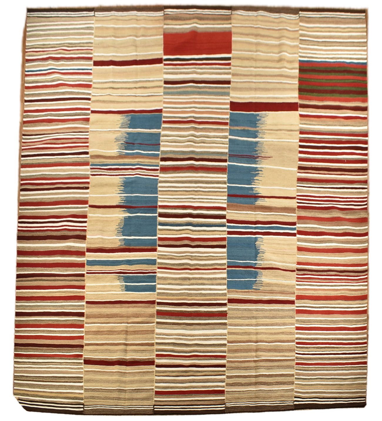 Dieser Kelim Teppich ist aus 100% persischer Hochland Wolle gefertigt, die von Hand gekardet und gesponnen wurde. Das sorgt für eine unvergleichliche Textur und Haltbarkeit. Die natürlichen Erdtöne und die bunten Farbverläufe im Streifenmuster verleihen Ihrem Raum eine warme und einladende Atmosphäre.
