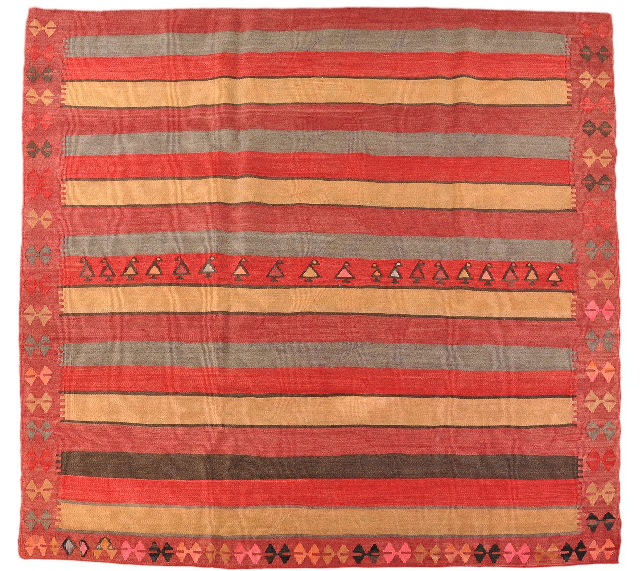 Mit einer Размер von 180 x 180 cm ist dieser Kelim vielseitig einsetzbar – sei es als Bodenbelag, Wandbehang oder dekoratives Element in Wohnräumen. Seine perfekte Erhaltung zeugt von der hochwertigen Verarbeitung und der Sorgfalt, mit der er gefertigt wurde.
