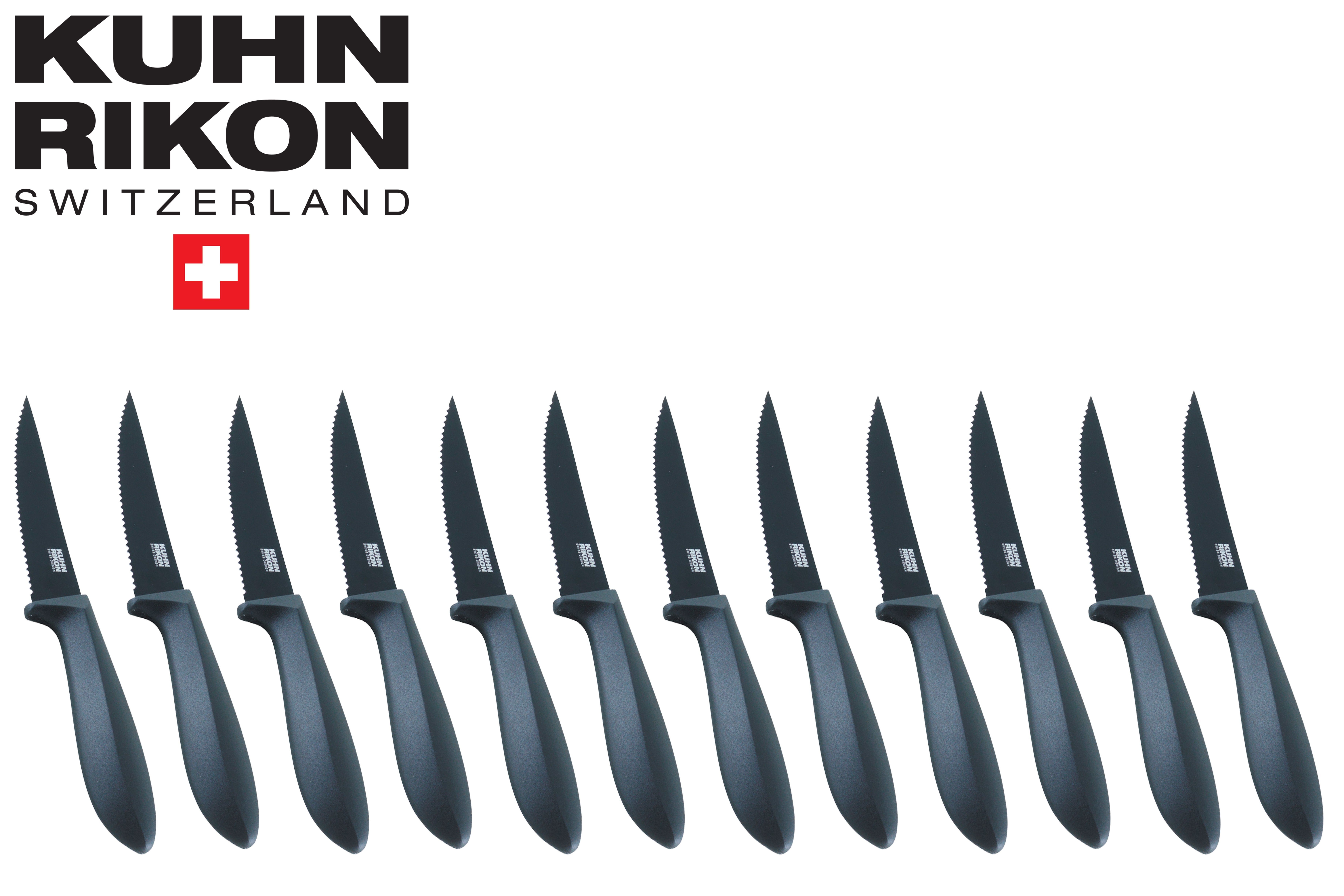 KUHN RIKON COLORI® V Steakmesser-Set 12-teilig Japanisscher Edelstahl Все 12 Messer enthalten einen separaten Klingenschutz Die Klingen der COLORI ® V Steakmesser werden in einem Glühofen bei über 1000°C erhitzt. Das Ergebnis ist härterer Stahl, flexibel und korrosionsbeständig. Die polierten Klingen werden beidseitig von Hand geschliffen. Die einseitig gezackte Klinge lässt das Messer mühelos durch alle Arten von zubereitetem Steak gleiten. Ideal auch als Brötchenmesser geeignet. Длина: 220 mm Klinge: Rostfreier japanischer Edelstahl Griff: Kunststoff