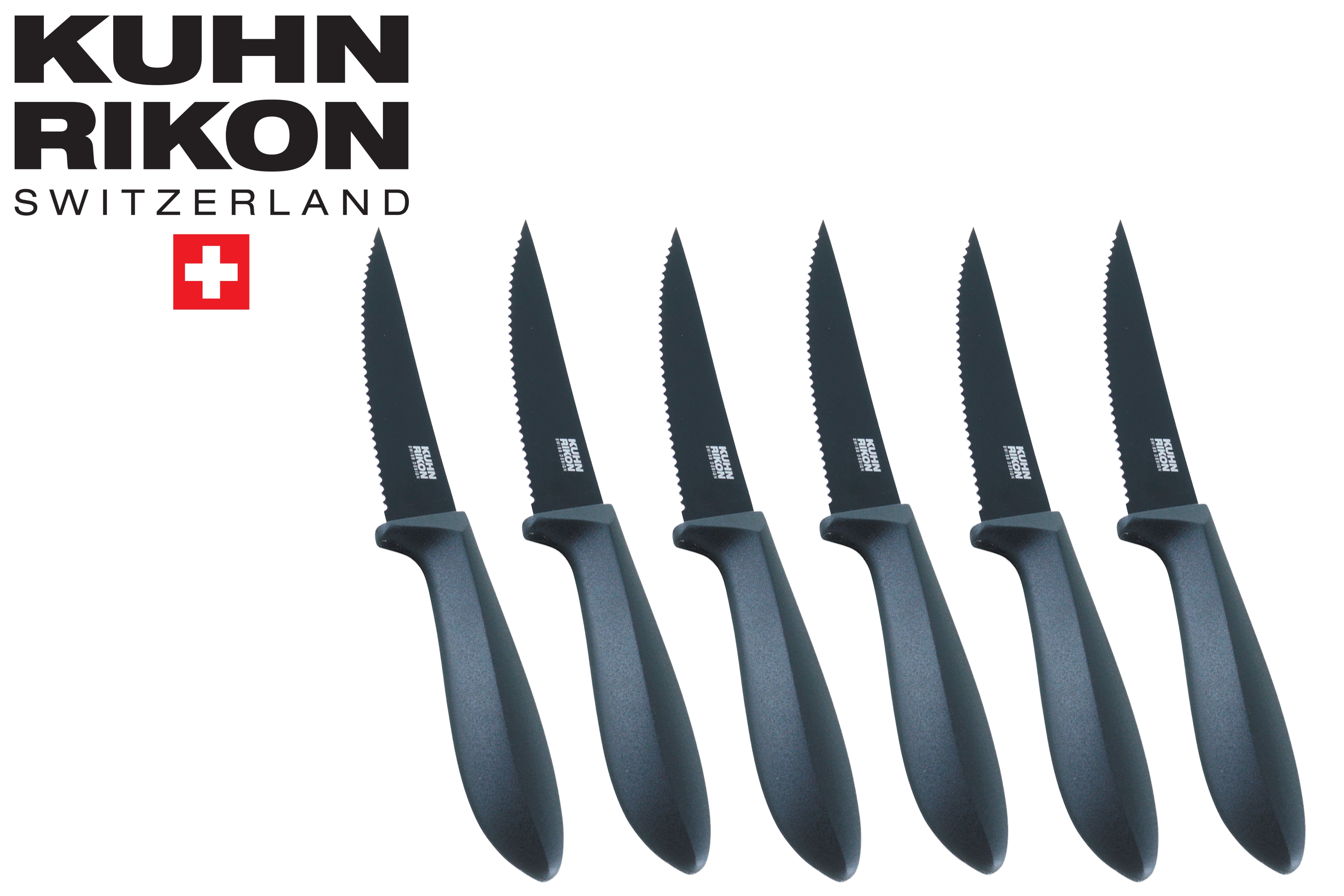 KUHN RIKON COLORI® V Steakmesser-Set 6-teilig Japanisscher Edelstahl Все 6 Messer enthalten einen separaten Klingenschutz Die Klingen der COLORI ® V Steakmesser werden in einem Glühofen bei über 1000°C erhitzt. Das Ergebnis ist härterer Stahl, flexibel und korrosionsbeständig. Die polierten Klingen werden beidseitig von Hand geschliffen. Die einseitig gezackte Klinge lässt das Messer mühelos durch alle Arten von zubereitetem Steak gleiten. Ideal auch als Brötchenmesser geeignet. Длина: 220 mm Klinge: Rostfreier japanischer Edelstahl Griff: Kunststoff