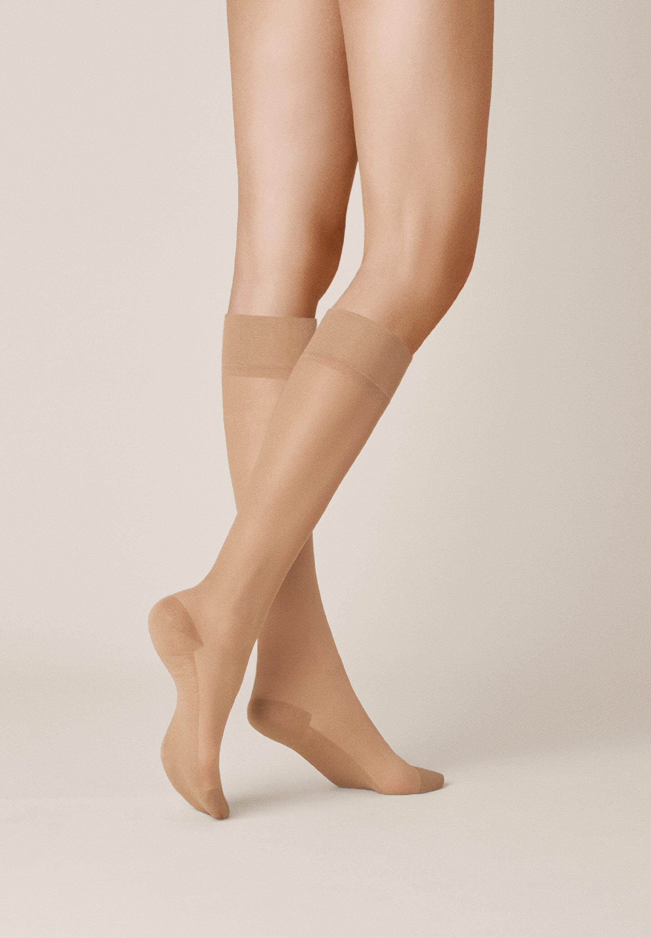 Die COTTON SOLE Kniestrümpfe in 20 DEN Optik vereinen Eleganz und Funktion. Die transparenten Kniestrümpfe mit atmungsaktiver Baumwoll-Sohle machen die Strümpfe zu einem täglichen Begleiter. Das sorgt für Wohlfühlklima in den Schuhen, da dank der Baumwoll-Sohle die Feuchtigkeit schnell aufgenommen wird. Die atmungsaktive, hautfreundliche Baumwolle in Spitze, Sohle und Ferse eignen sich perfekt für anspruchsvolle Füße und der druckfreie Komfortbund versprechen höchsten Tragekomfort den ganzen Tag.