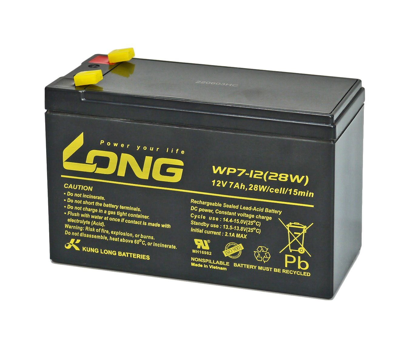 Kung Long Blei-Vlies-Akku mit 7000 mAh. Die Höhe der F2-Faston-Stecker beträgt 102 mm (F2 ≙ 6,3mm). Der wartungsfreie und hermetisch geschlossene Akku überzeugt durch eine besonders hohe Leistung und ist universell einsetzbar. Er ist ebenfalls für den Standby-Betrieb geeignet und schwer entflammbar.