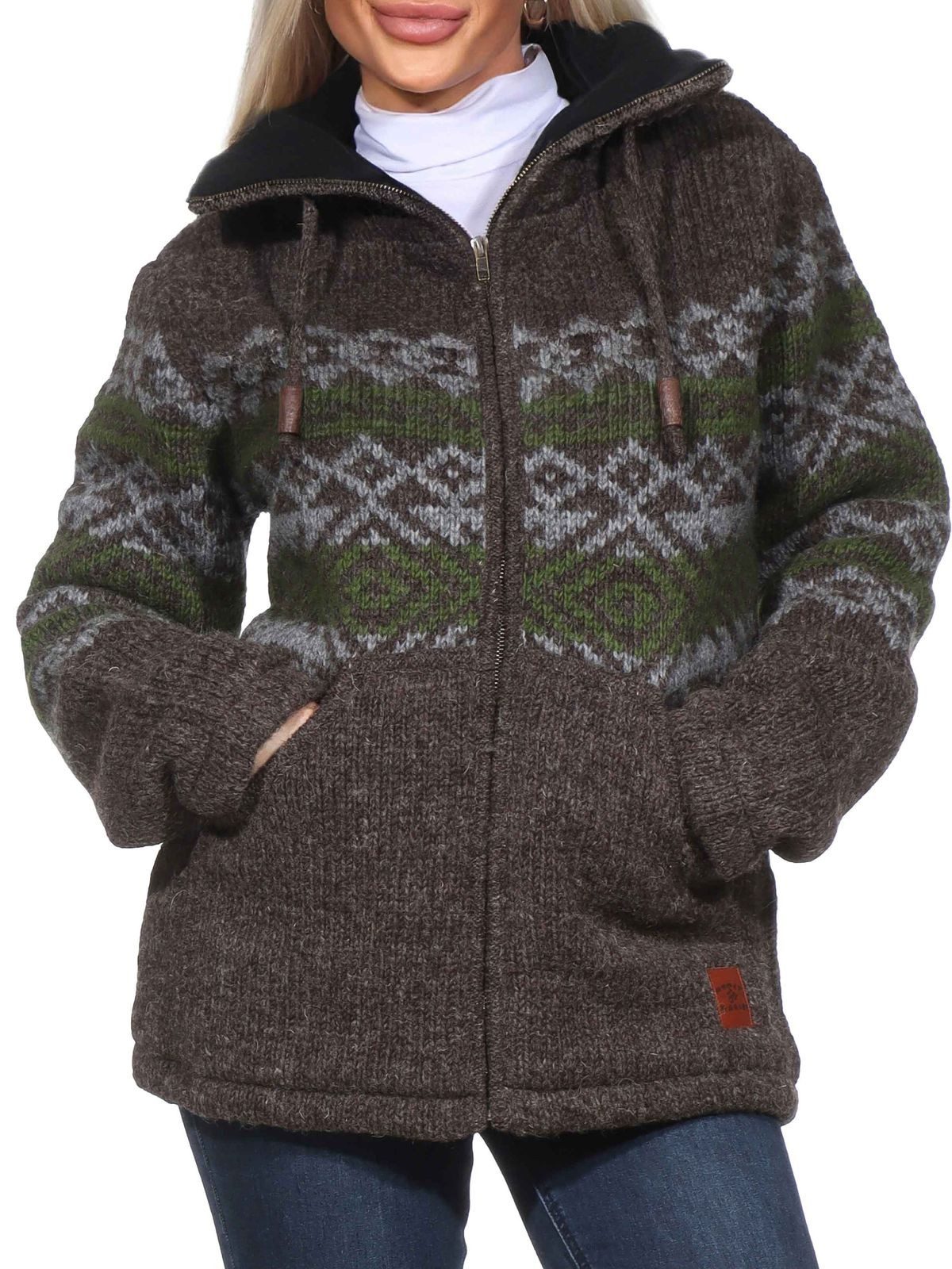 Der gefütterte Hochkragen der Nepal Strickjacke hält Ohren und Hals auch ohne zusätzliche Accessoires angenehm warm. .Das sieht nicht nur gut aus sondern fühlt sich auch extra weich an und hält an kalten Wintertagen richtig warm.