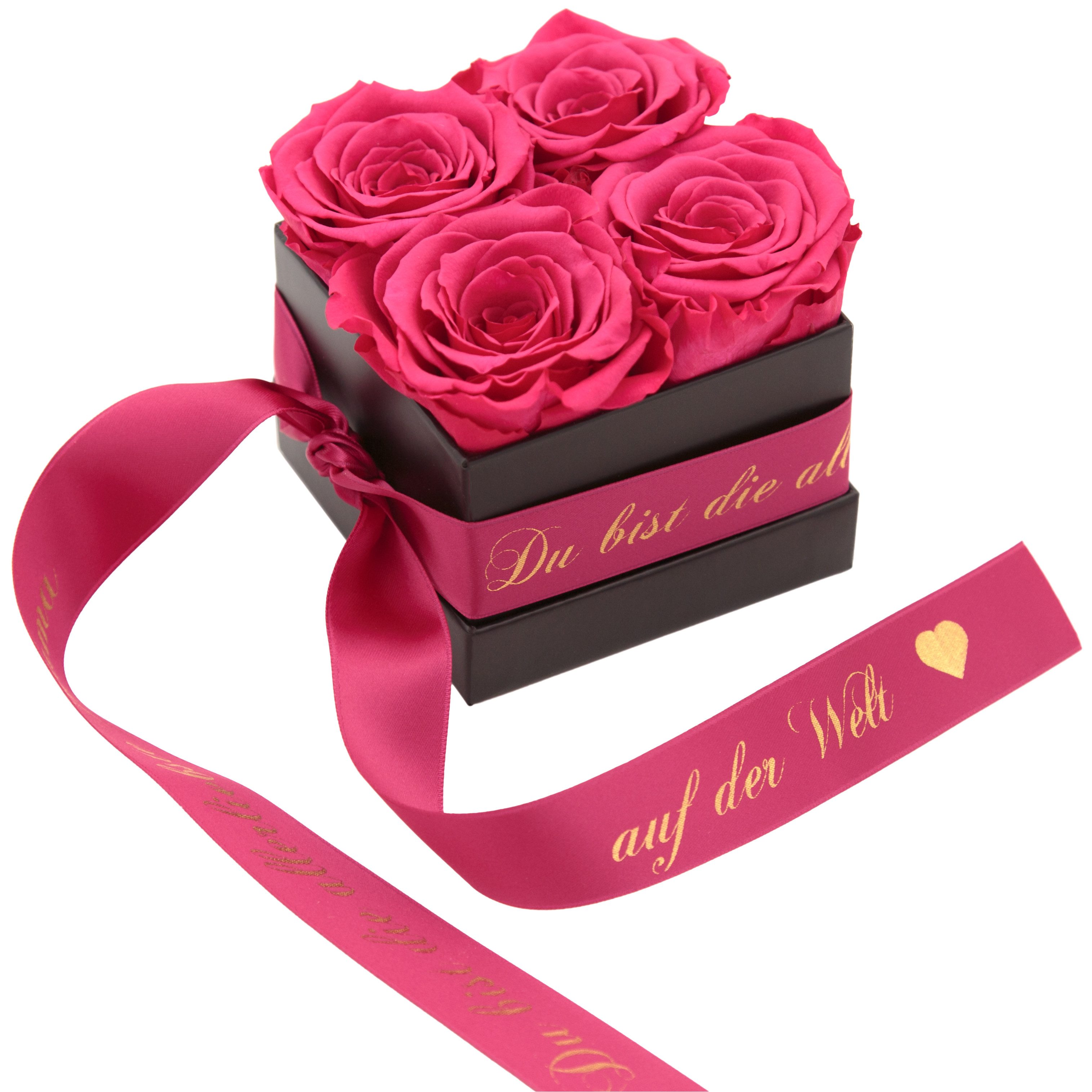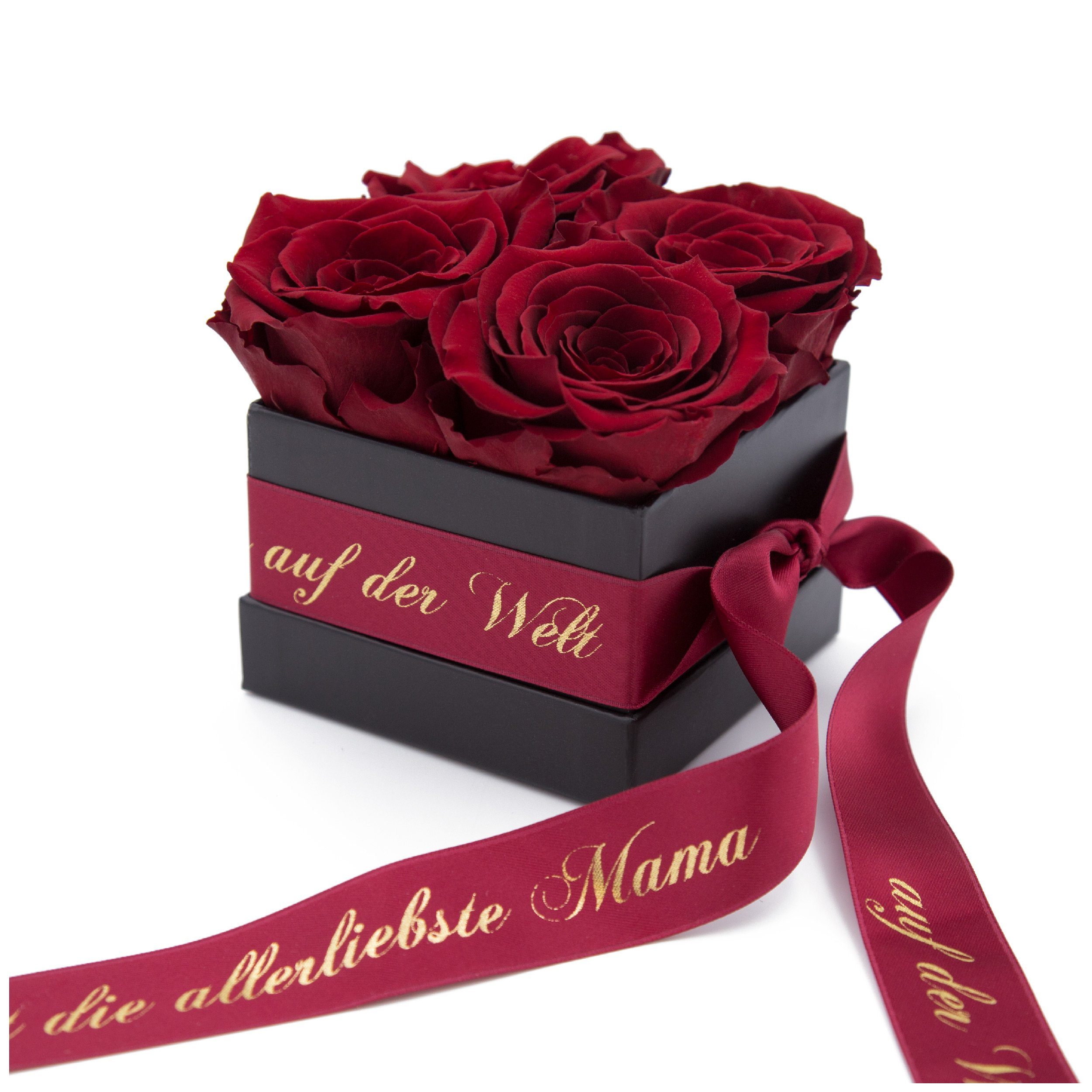 Hinweis Lieferumfang | Schwarze Rosenbox mit 4 ewigen Rosen, Satinband bedruckt in Goldschrift mit Du bist die allerliebste Mama auf der Welt |