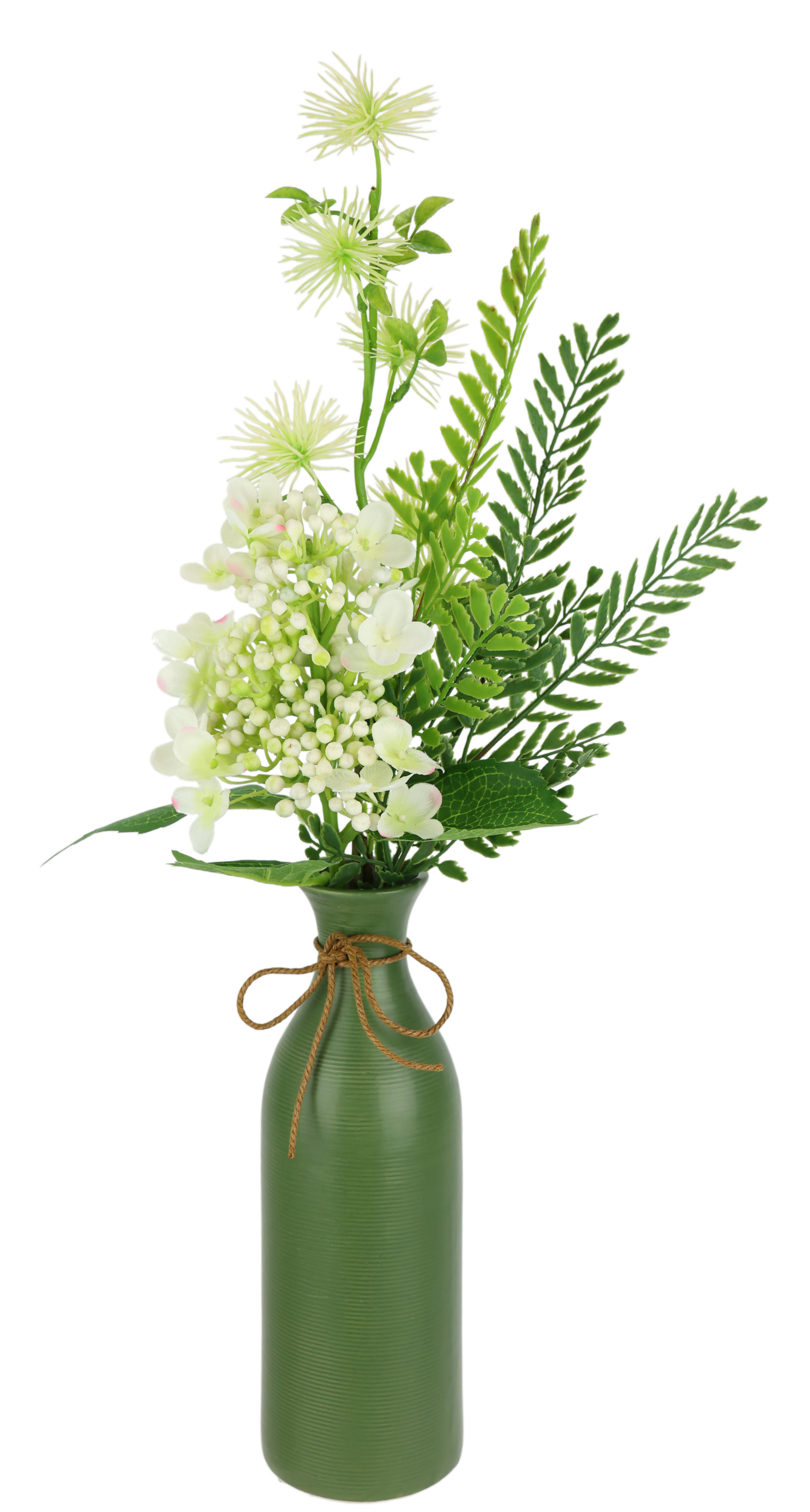 Bringen Sie zeitlose Eleganz in Ihr Zuhause mit diesem kunstvoll gestalteten Kunstblumen-Arrangement. Die Kombination aus zarten Rispenhortensien, Zaubernuss und filigranen Farnzweigen in einem harmonischen Grün-Weiß-Farbspiel schafft einen natürlich anmutenden Blickfang. Die 50 cm hohe Komposition wird von einer stilvollen grünen Keramikvase getragen, die durch eine rustikale Kordelschleife einen charmanten Akzent erhält. Mit einer Breite von 20 cm und einer Tiefe von 15 cm eignet sich dieses Arrangement perfekt als Mittelpunkt für Ihre Tischdekoration oder als elegantes Accessoire bei Hochzeiten und anderen festlichen Anlässen. Die täuschend echt wirkenden Blüten und Blätter bleiben dauerhaft schön und benötigen keine Pflege. Ein zeitloses Dekoelement, das Ihrem Raum ganzjährig eine frische, lebendige Note verleiht.