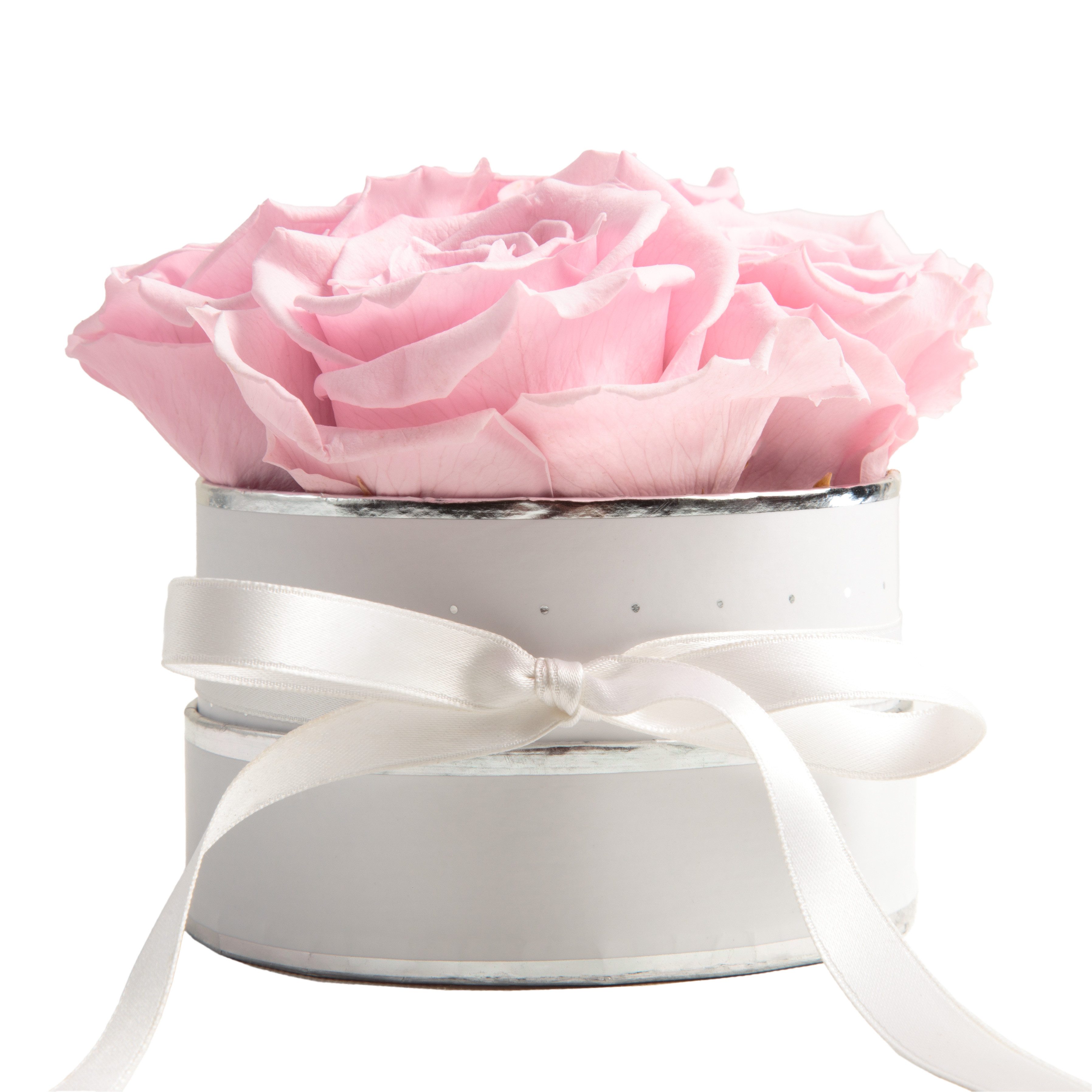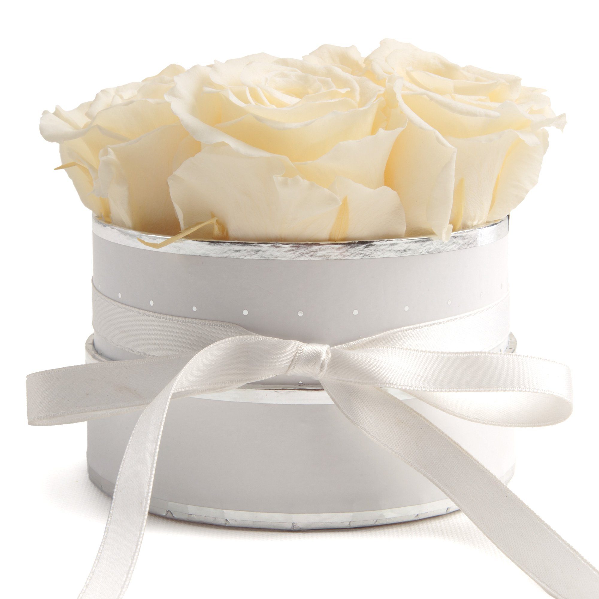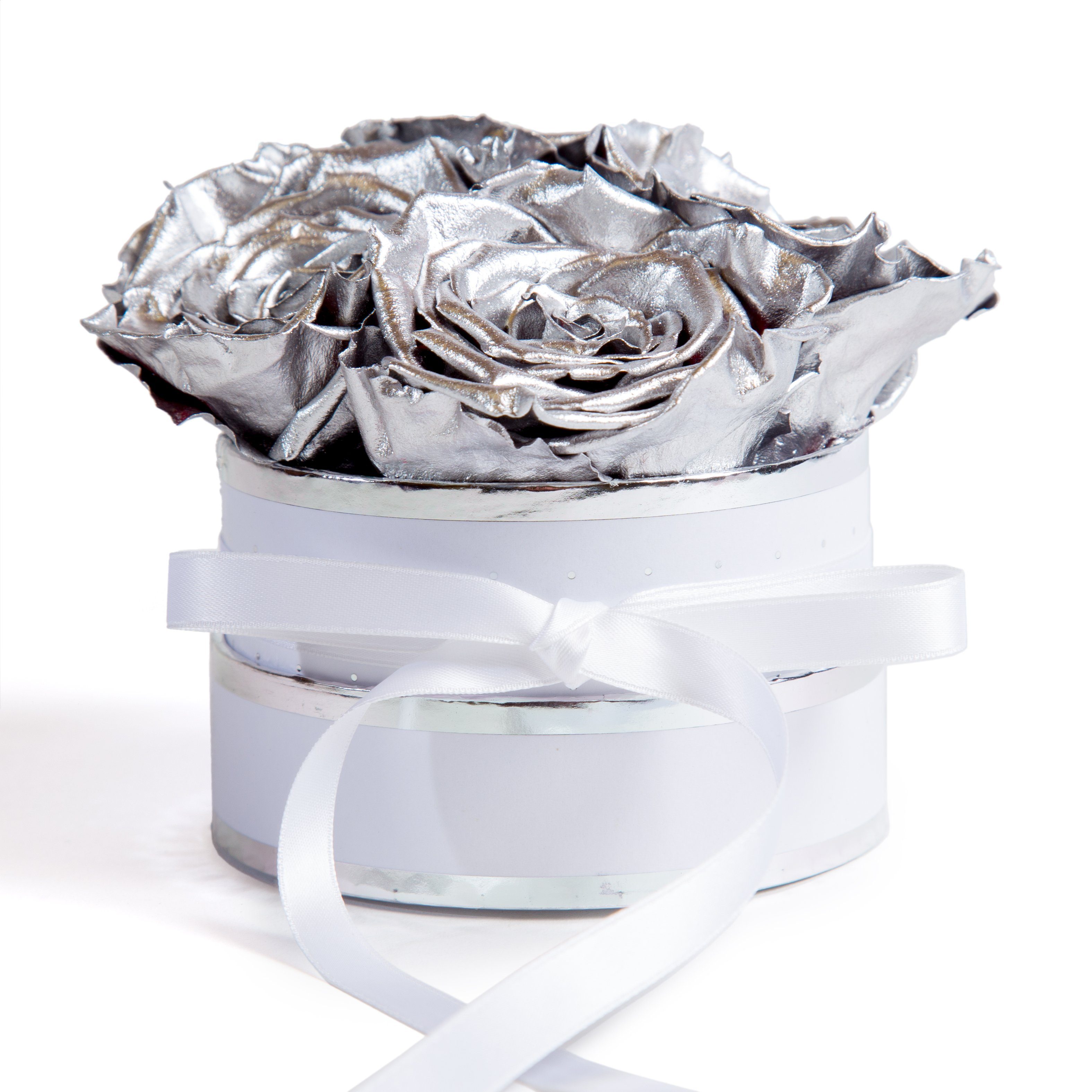 Lieferumfang | Blumenbox weiß mit silberfarbenen Punkten bedruckt, 4 echten Infinity Rosen konserviert, Verziert mit Satinband in Weiß |