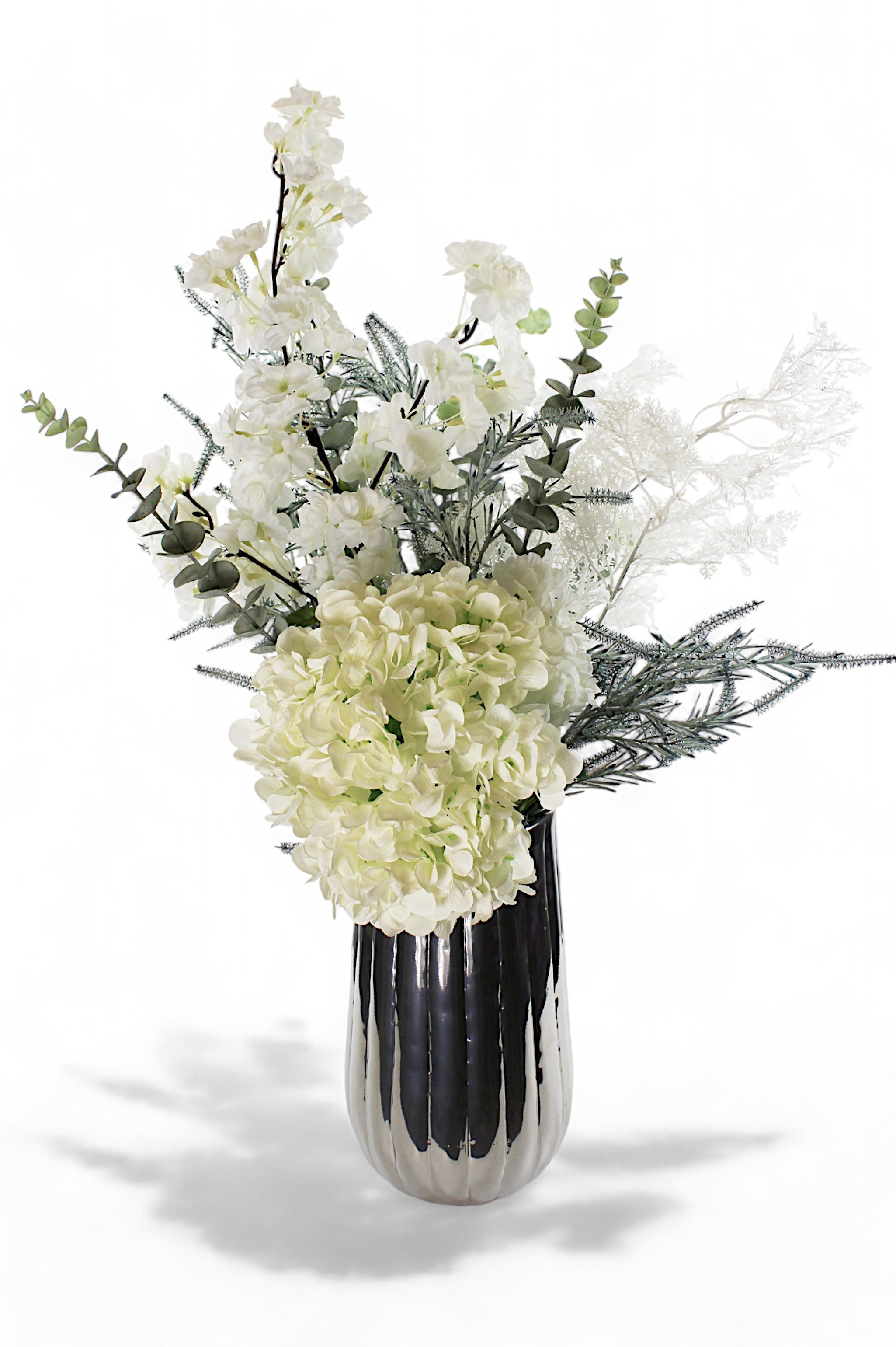 Diese schöne Aluminium Vase wird Ihnen mit einen hochwertigen, handgebundenen Kunststrauß in Weißtönen geliefert.