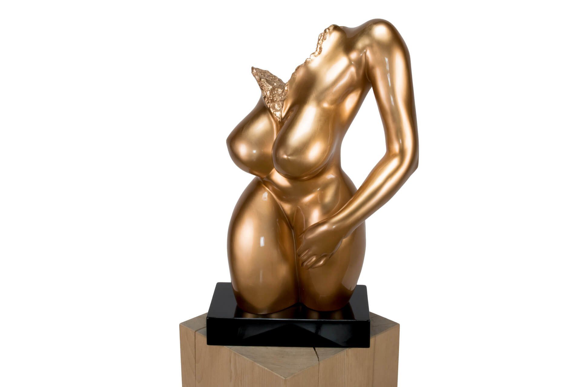Die imposante Skulptur 'Spiritual Entrance' nimmt Sie mit auf eine spirituelle Reise der Abstraktion und brilliert mit goldenem Körper auf schwarzem Sockel in eleganter Pose. Der verführerische Körper ist handgefertigt und ein Sinnbild der weiblichen Schönheit. Holen Sie sich diese imposante Statue in Ihren Flur und bringen Sie Ihre Gäste zum Staunen.