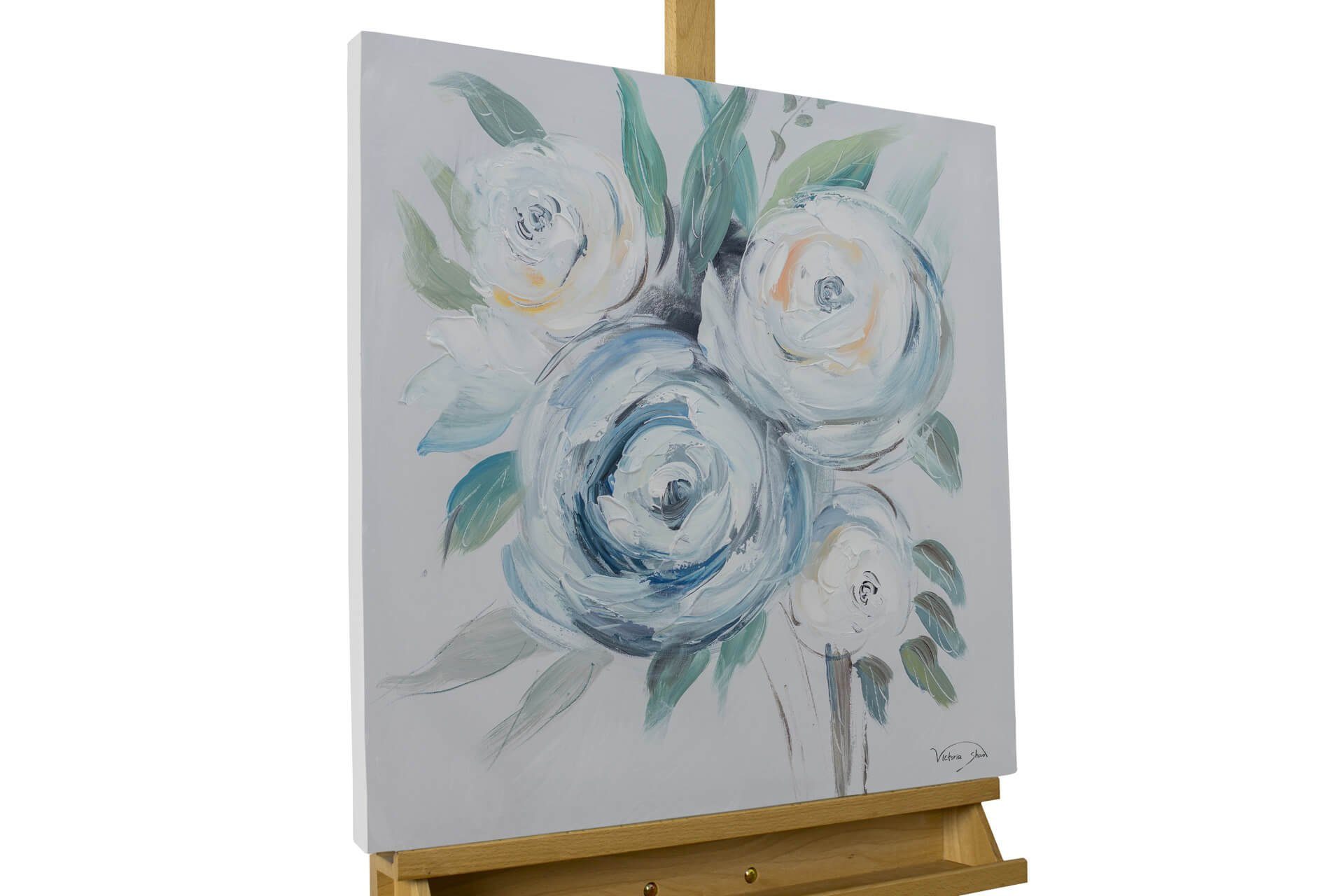 Mit Blumen lassen sich zahlreiche Emotionen ausdrücken, denn jede Blüte hat einen symbolischen Wert. 'Duftende Rosen' transportieren in Ihr Schlafzimmer das Gefühl der Liebe und sagen mehr als tausend Worte. Die handgemalte Hommage an diese Blumenart ist in Blau und Weiß koloriert, wodurch sie im Shabby-Chic-Stil eine zeitlose Eleganz ausstrahlt.