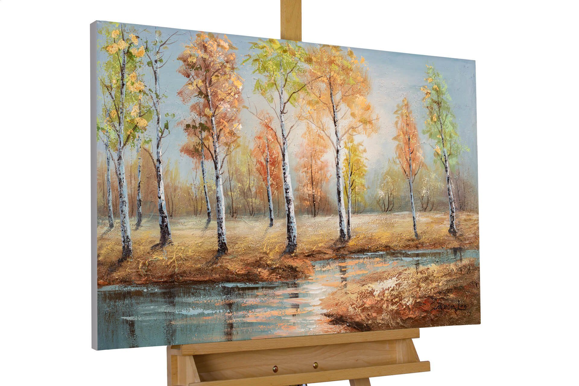 Im Herbst herrscht eine ganz besondere Atmosphäre und diese verbildlicht sich auf dem handgemalten Acrylgemälde 'Fall Melancholy', auf dem Sie in Ihrer Praxis einen Wald in herbstlichem Orange bewundern dürfen. Durch die idyllische Kulisse schlängelt sich ein blauer Fluss und die Spitzen der Bäume leuchten vom Sonnenlicht angestrahlt in Goldglanz.