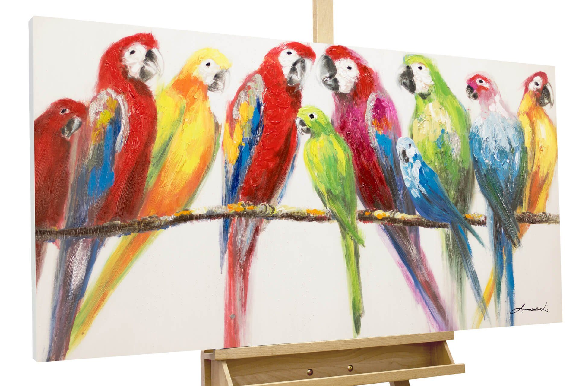 Mit ihren strahlenden Federn in verschiedenen Bunttönen posiert die Papageienfamilie auf dem Acrylgemälde mit Silberglanz für ein amüsantes 'Familienportrait'. Auf vertraute Weise tauschen die prachtvollen Vögel Blicke aus und signalisieren Zusammenhalt. Im Kinderzimmer stellt die Truppe eine charmante Gesellschaft für Ihre Sprösslinge dar.