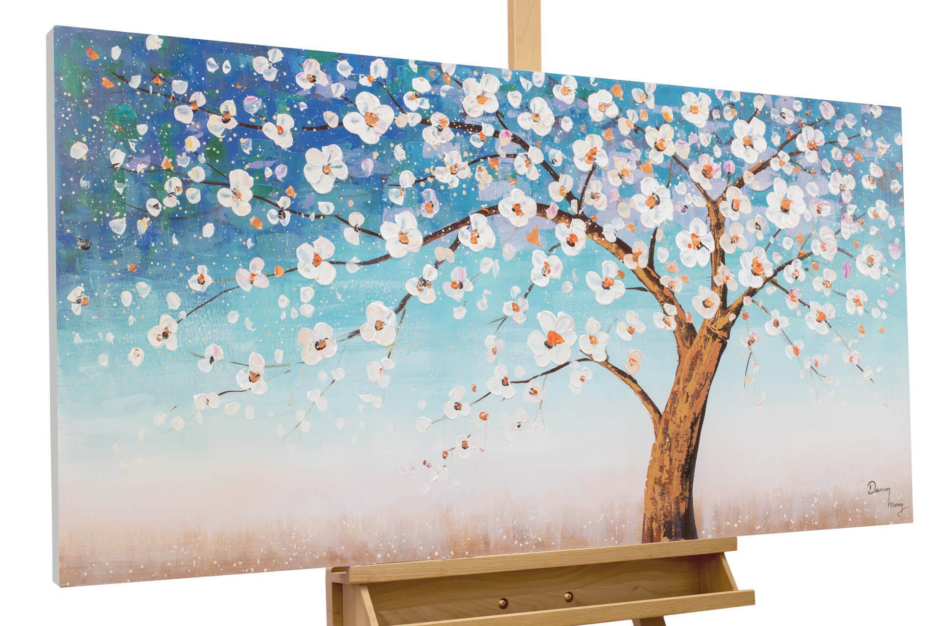 Dieses handgemalte Acrylgemälde erinnert an einen warmen 'Frühlingsabend', wenn der Himmel sich langsam blau färbt und die Sonne schwindet. Unter einem Kirschbaum mit Blüten in Weiß können Sie sich vom Alltag ausklinken und ruhevolle Momente genießen. Ergänzen Sie Ihr Schlafzimmer mit diesem Bild und spüren Sie seine positive Ausstrahlung.