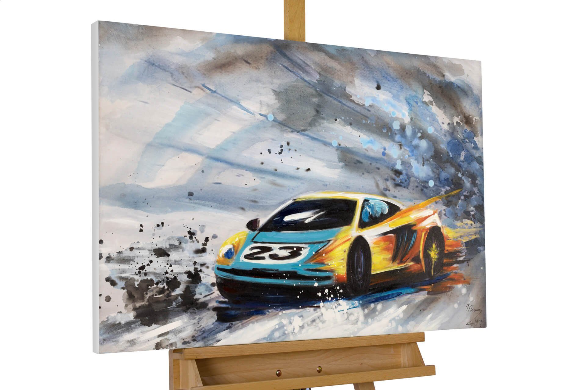 Der 'Tunnelblick' des Rennfahrers ist nach vorne auf die asphaltierte Straße gerichtet. Das Acrylbild veranschaulicht den schnellen Sportwagen in gelben und blauen Nuancen und besticht mit der handgemalten Geschwindigkeit, die das Auto auf der Leinwand zurücklegt. Lassen Sie sich von den großen Zielen der Sportart hautnah in Ihrem Büro inspirieren.