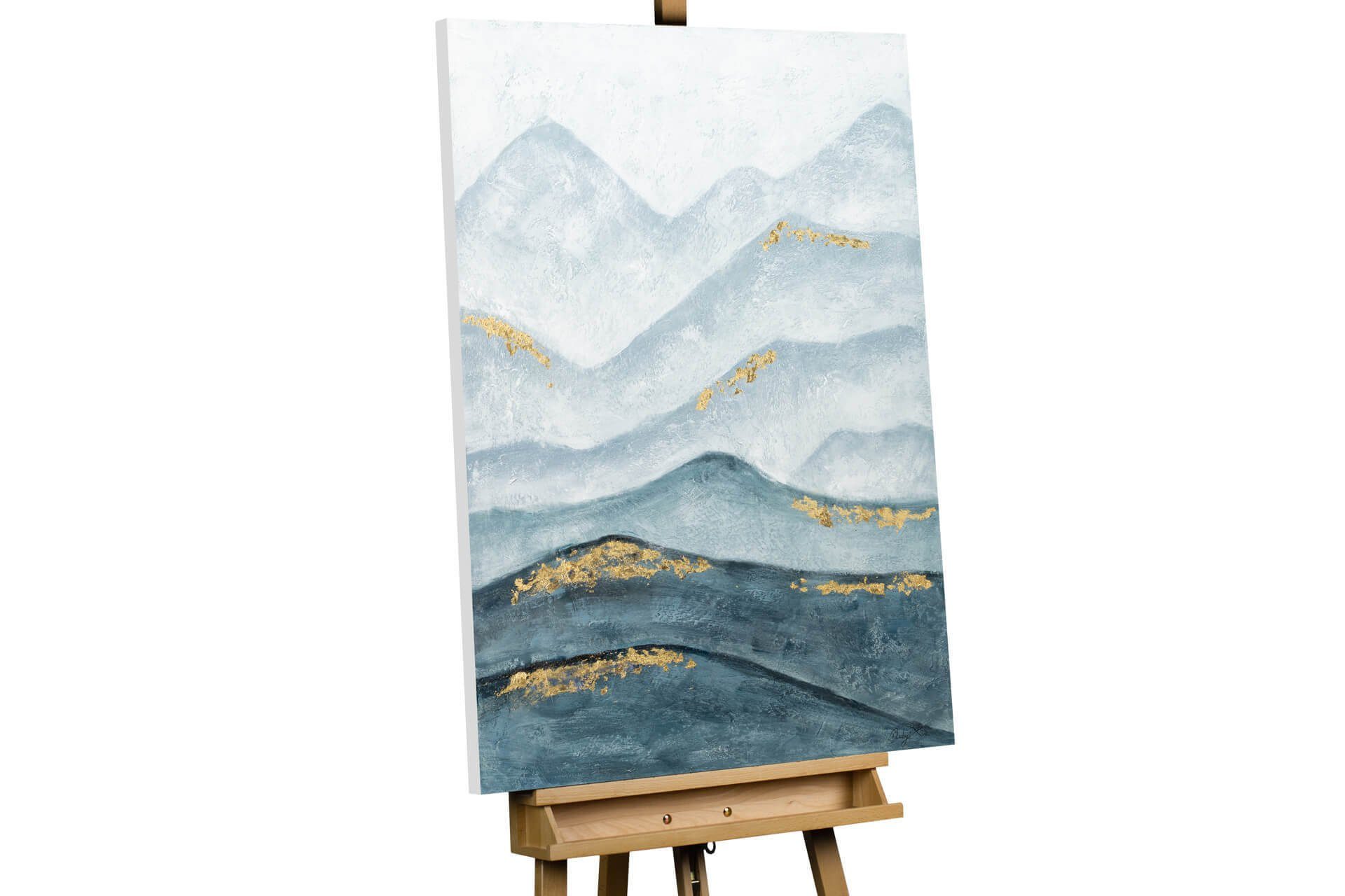 'Verzauberte Berge' reihen sich parallel aneinander auf einem Hintergrund in Grau und erinnern an die Dynamik des Meeres. Die handgemalten Berge in Petroltönen reflektieren die Ruhe einer unberührten Natur, überzogen mit goldglänzenden Pfaden. Dieses Acrylgemälde gibt Ihrem Flur ein Gefühl von Spiritualität und Verbundenheit mit der Wildnis.