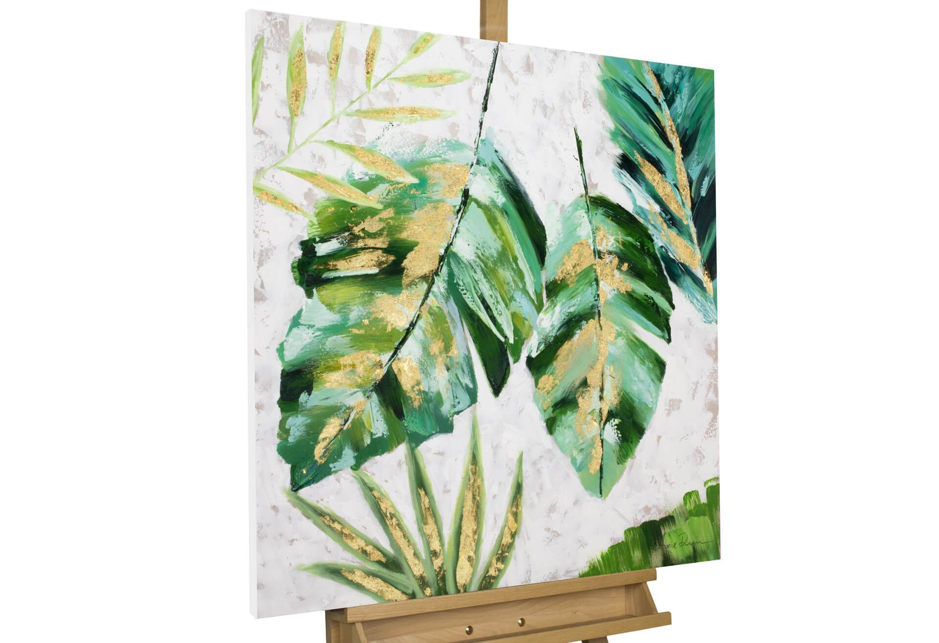 In verschiedenen Grüntönen und edlem Goldglanz verleihen 'Wehende Blätter' dem extravaganten Acrylgemälde einen exotischen Flair. Bereichern Sie Ihr Wohnzimmer mit einer entspannten Stimmung, die auch Ihre Gäste unmittelbar spüren werden. Mit dem Bild beweisen Sie Ihren stilsicheren Kunstsinn und beschenken sich selbst mit handgemalter Kunst.