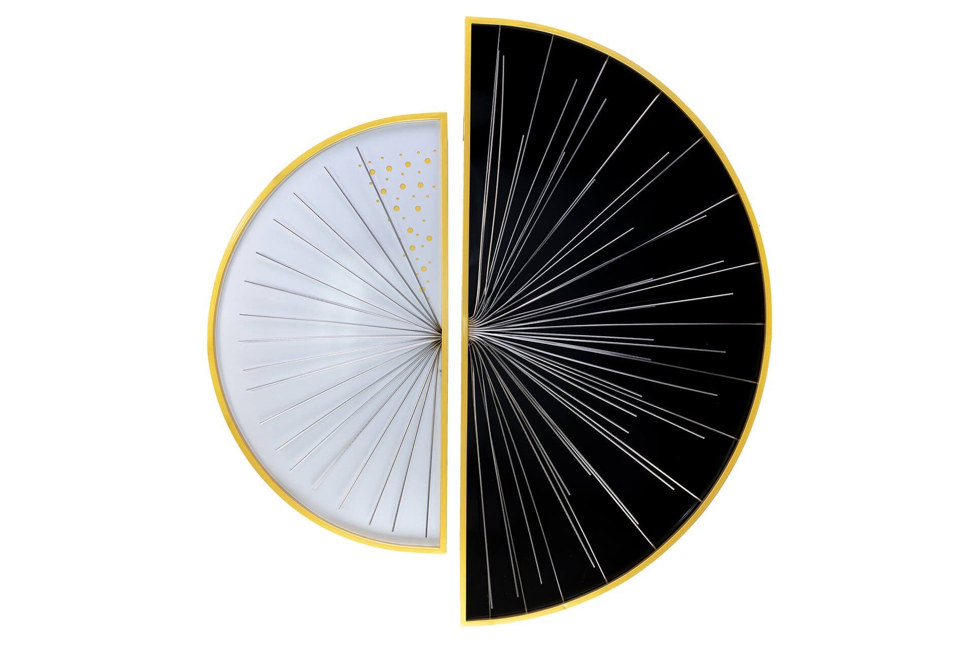 Tauchen Sie in Ihrem Schlafzimmer in astronomische Sphären ab: 'Between Moon and Sun' zeigt einen großformatigen Halbkreis in schwarzer Farbe und einen Halbkreis in Weiß, die sich mithilfe goldglänzender Metallstreben zu einem handgefertigten Ganzen ergänzen. Die Wanddeko symbolisiert das perfekte Zusammenspiel zwischen Sonne und Mond.