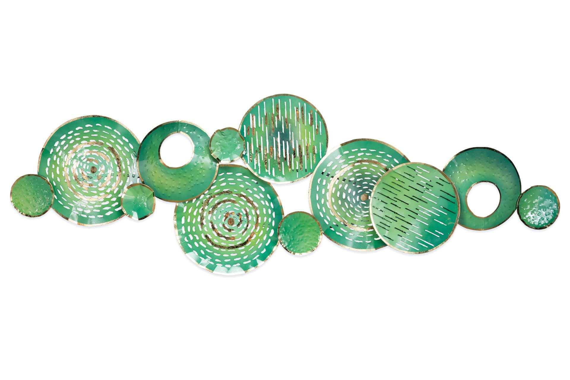 Die abstrakte Wandskulptur 'Cycle of Life' erinnert in Form und Farbgebung an Seerosenblätter, auf denen sich in Goldglanz das Sonnenlicht reflektiert. Die unterschiedlich großen Kreise strahlen in leuchtendem Grün von der Wand in Ihrem Esszimmer und bilden eine harmonische Einheit, was die handgefertigte Wanddeko zu einem echten Hingucker macht.