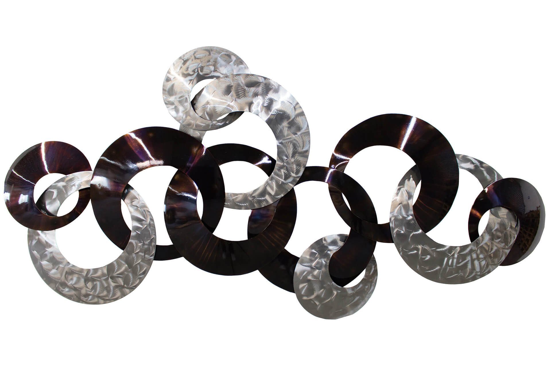 In Ihrer Wandskulptur 'Dialog der Kreise' gehen verschiedene Muster und Farben eine Verbindung ein. Metallringe überlappen sich zu einem Arrangement, wobei die einen silber schimmern und wiederum von anderen in Rotbraun kontrastiert werden. Diese Arbeit im trendigen Retroschick überzeugt auch Ihre Gäste!