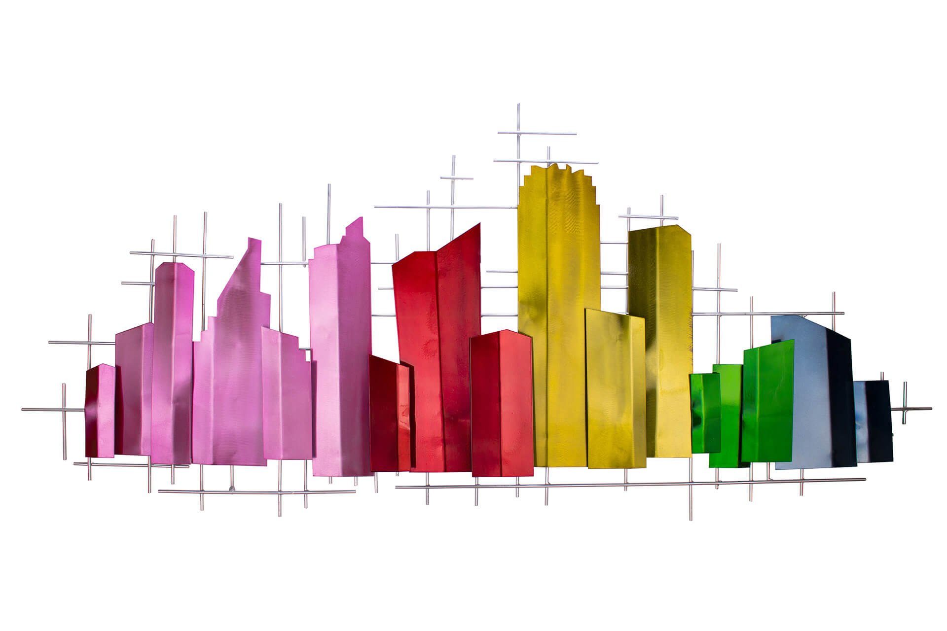 'Domestic Charm' erinnert durch die Anordnung verschieden großer Formen an eine Skyline und transportiert urbanes Flair in Ihr Büro. Das XXL-Metallbild überzeugt durch den Kontrast der Buntheit der Formen mit dem silberfarbenen Gestell, das sie zusammenhält. Lassen Sie sich von der Kreativität der abstrakten Metall-Wanddeko begeistern!