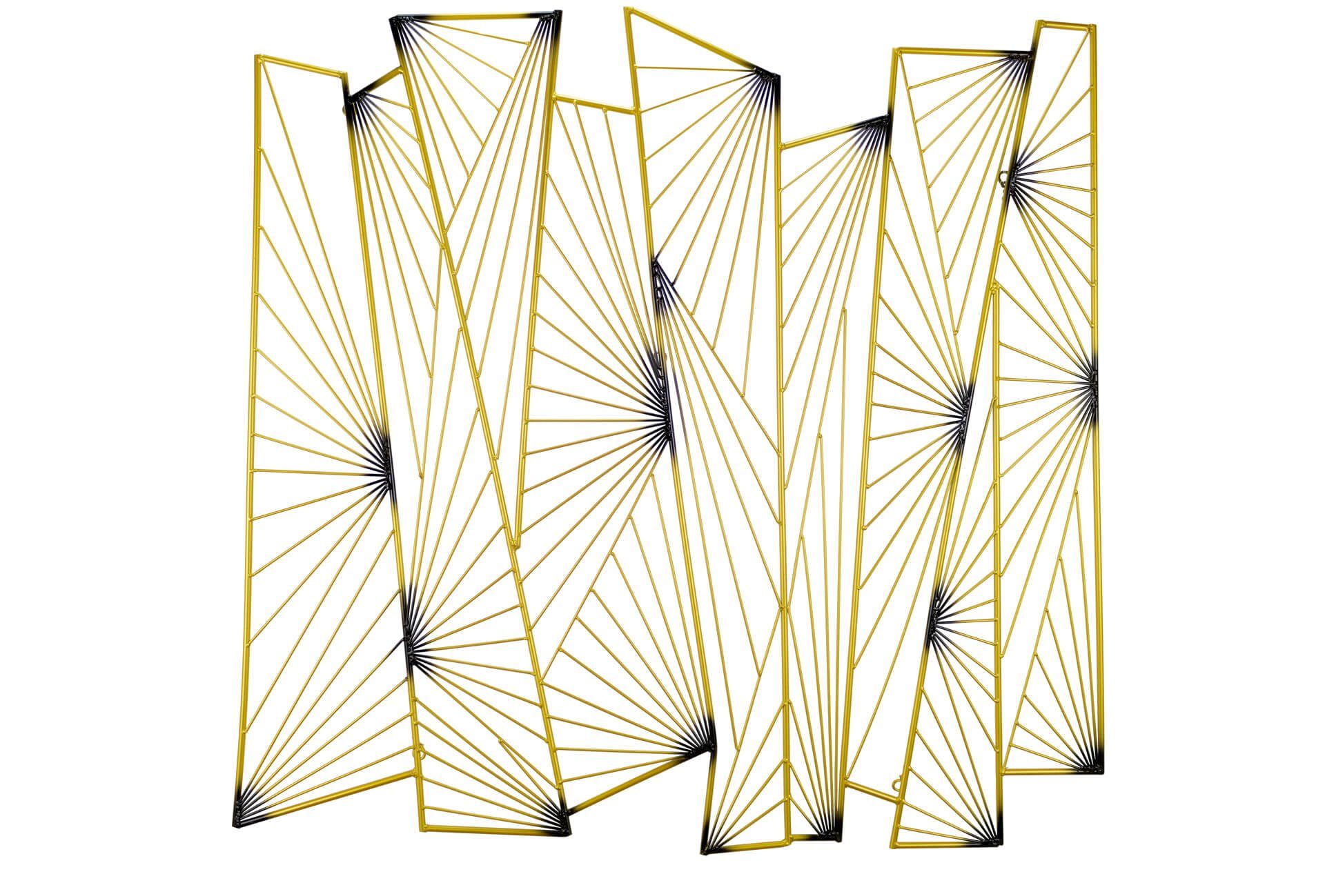 Ein 'Magisches Kabinett im Art Déco Stil' hält hinter filigranen Streben in Gold eine geheimnisvolle Welt verborgen. Schenken Sie der edlen Wanddekoration einen besonderen Platz in Ihrem Wohnzimmer und profitieren Sie von der mystischen Aura, die von dem abstrakten Wandschmuck in handgefertigter Qualität ausgeht.